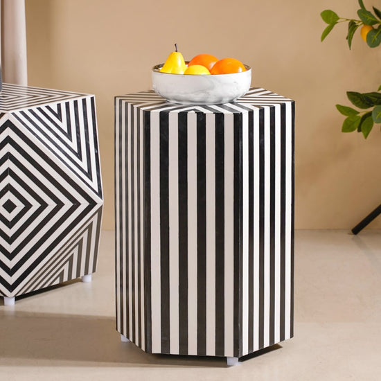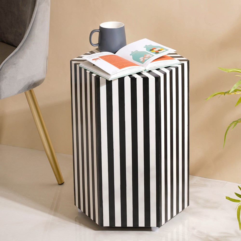 Our stunning coffee table is a true masterpiece that will transform your living space. With its unique cuboid hexagonal shape, this table effortlessly stands out from the crowd. The black and white striped patterns adorning the surface create a striking visual impact, while the durable wooden inner frame ensures long-lasting quality. The resin outer layer not only adds a touch of sophistication but also provides a smooth polished surface, perfect for showcasing your favourite decor pieces. Elevate your interior design with this statement piece that embodies elegance and craftsmanship.