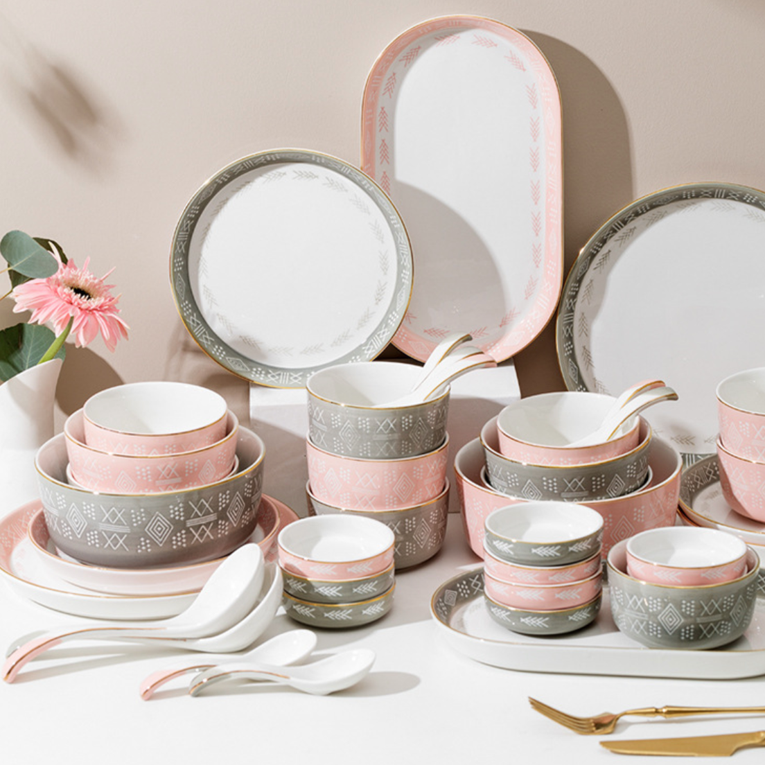 Pink is all about sweetness and tenderness, from the soft blush of a rose petal to the streaks of summer sunsets. Bringing the beauty of this subtle yet soothing colour to your table is our Azo Pink 27 Piece Dinner Set For 6. Blending a pristine white shade with a feminine pink, this dinner set lets you embrace the gentle things in life. A cluster of peonies blooming as the centrepiece, elegant wine glasses filled with your favourite red, and the components of the Azo dinner set laid flat - it doesn’t even get any more sophisticated than this! Cast in premium-quality ceramic, the elements of the set flaunt opulent golden rims for a touch of luxury, while the abstract details showcase attention to detail.