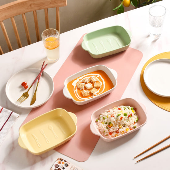 To ensure the longevity and excellent condition of your ceramic rectangular baking dish, place a soft cloth or a layer of parchment paper between each dish to prevent them from scratching or chipping when they come into contact. While the baking dish is dishwasher-safe, you can also choose to hand wash it using a gentle dishwashing detergent, warm water, and a soft sponge or cloth. Avoid abrasive scouring pads or harsh chemicals, which can damage the surface over time.