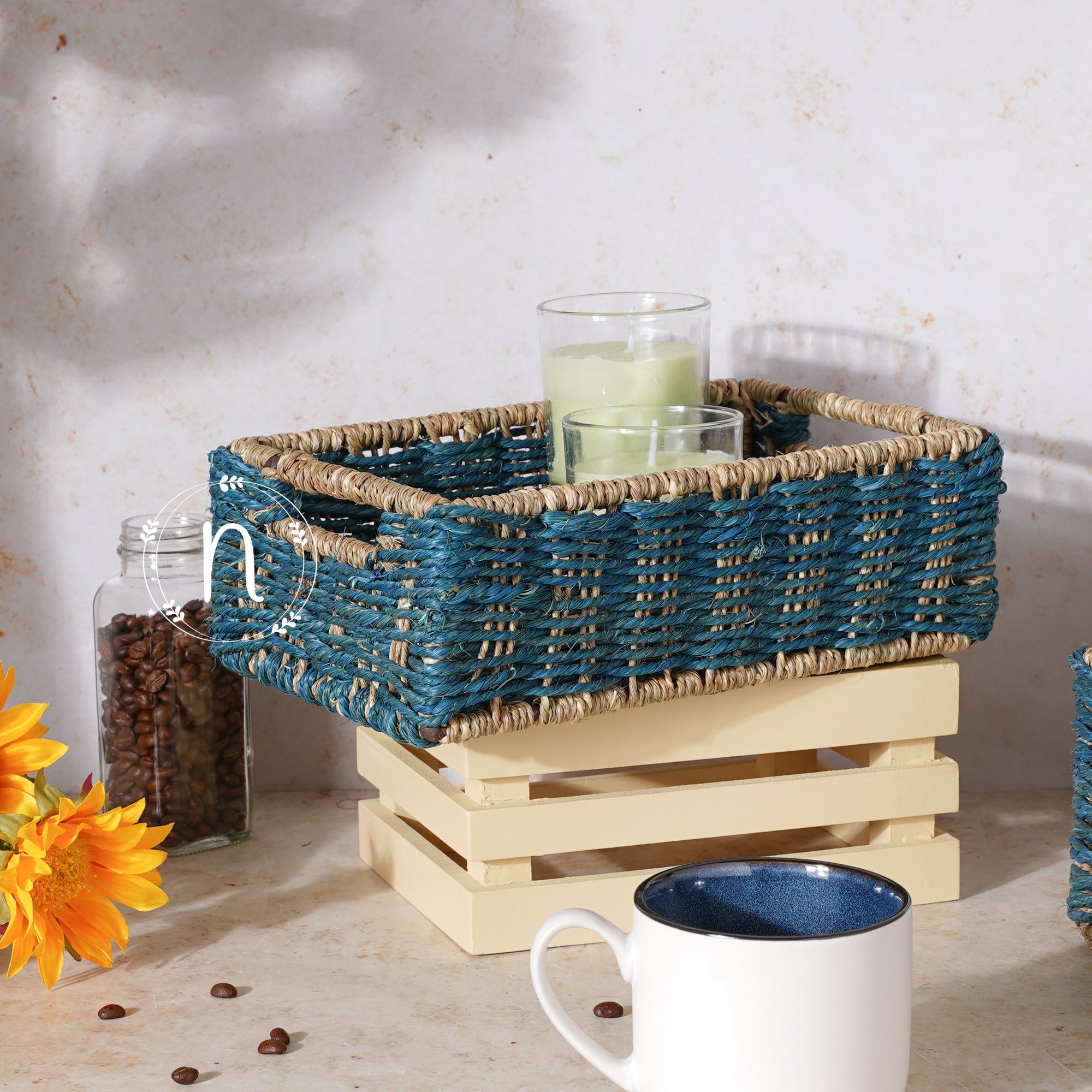 Braided and handwoven storage baskets in a set of 2 with handles made of Sabai grass which is a natural and eco friendly material. The rectangle shaped natural baskets with handle on a metal frame can be used for organising toys or bath products. It's naturally dyed blue and has a breathable material that is organic and creates a positive ambience at home.