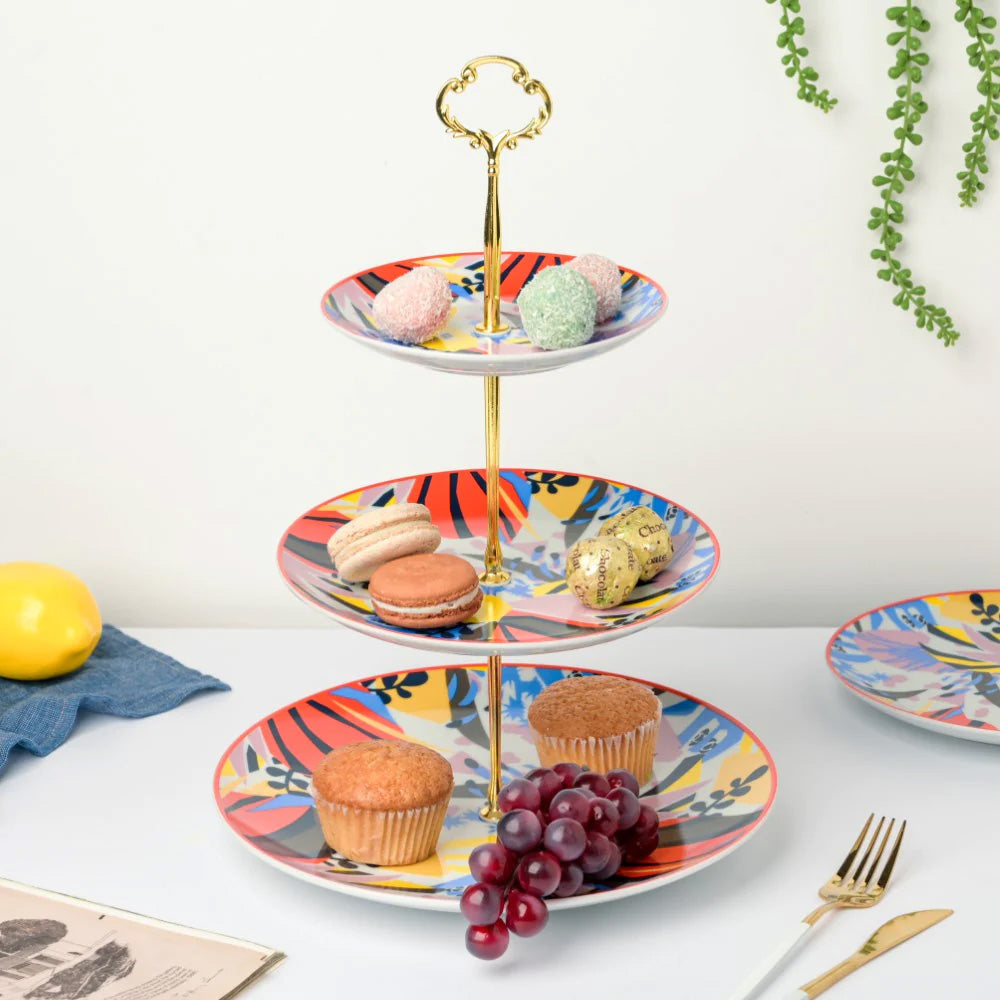 Enhance your dessert display with our 3-tier cake stand, crafted from high-quality ceramic and adorned with vibrant floral patterns. The plates, reminiscent of spring's cheerfulness, come in three distinct sizes, elegantly fitted with a lustrous golden stand. Topped with an ornately designed motif, this cake stand adds an opulent touch to any occasion. Perfect for showcasing snacks, cakes, cupcakes, and desserts, it brings both beauty and sophistication to your table, making every event truly special.