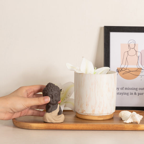 The Buddhist monk showpiece comes in an array of beautiful colors with detailed handwork and artisanal detailing by skilled artists. The monk figurine inspires happiness and prosperity in life. The beautiful decor object is a piece of art that not only adds to the aesthetic of your space but also has a deeper spiritual significance.