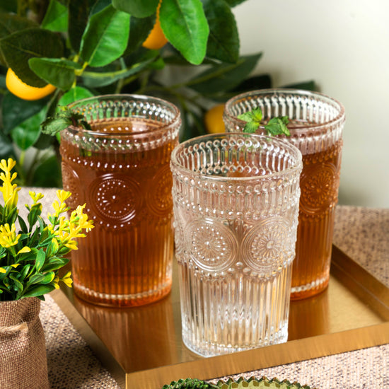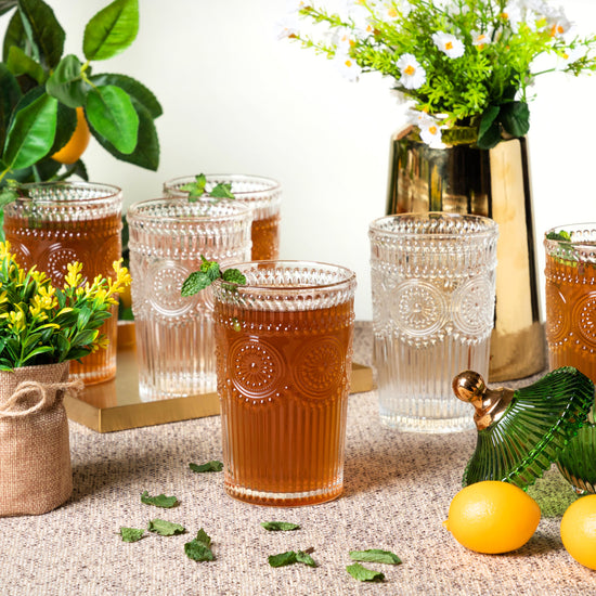 Indulge in timeless elegance with our set of 6 tall drinking glasses. Crafted with meticulous attention to detail, each glass showcases a mesmerizing hammered embossed texture that exudes sophistication and adds a touch of vintage charm to your table setting. With their tall and slender silhouette, these glasses offer a generous capacity, perfect for savouring your favourite beverages in style. Whether it's a refreshing glass of iced tea on a sunny afternoon or a classic cocktail at your next soirée, these glasses elevate every sip. Experience the perfect blend of exquisite craftsmanship and vintage design with our exceptional glassware collection.