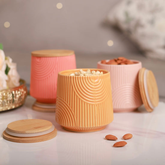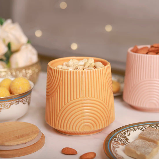 Simplify your storage solutions with our vibrant yellow ceramic jar set. This set includes two premium food-grade ceramic jars, perfect for storing a diverse range of food items, from dried fruits and candies to condiments and spices. Adorned with intricate abstract designs, each jar features an airtight wooden lid with silicon lining, preserving the contents' freshness. These versatile canisters double as elegant organizers for trinkets, jewelry, and non-food items.