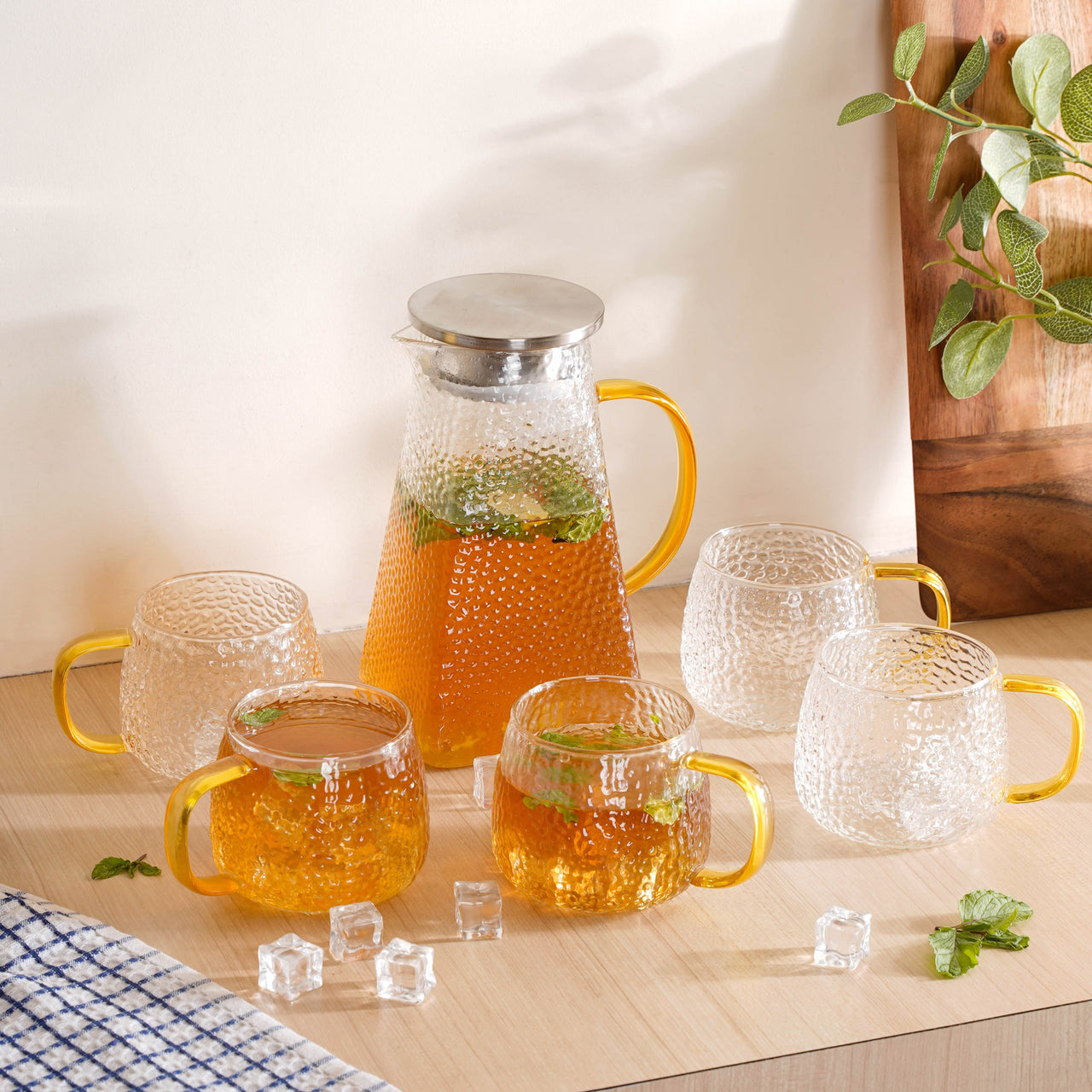 The jug and mug set also makes for a great gifting option and is ideal for serving chilled lemonade, orange juice, cranberry juice, pomegranate juice, pineapple juice, mango juice or any seasonal drink of choice. The glass jug sets with their tinted forms contrast beautifully against the served beverages and become the highlight of the get-together. The carafes by Nestasia can also be used as decanters for serving malt or wine during evening parties. When paired with the glass tumblers by Nestasia, the table spread will look truly elegant.