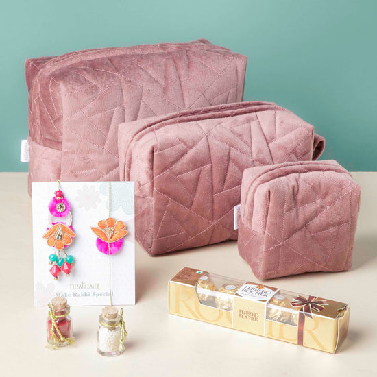 The quilted soft Cosmetic Bags Set of 3 have soft velvety surfaces and plush textures throughout. The vanity pouches, which come in three different sizes, have been expertly hand-stitched to offer enough room to be used as a travel kit or to hold one's necessities, such as makeup, stationery, or jewellery. For easier access and storage, the makeup vanity pouches feature a zipper closure. A waterproof liner inside each of the three pink vanity pouches ensures that no component will leak out in cases of spillage. The vanity pouch set's dusty pink colour makes them look lush and exquisite.