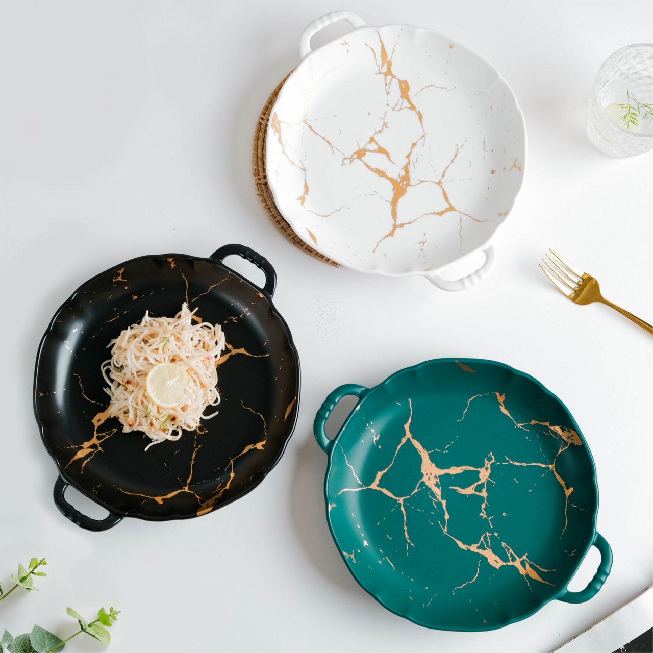 Explore Nestasia's range of round marble plates with handles, featuring an assortment of vibrant colours to match your style. Our ceramic platters boast exquisite gold detailing, ensuring a conversation-worthy addition to your table. With their unique wavy rims and eye-catching hues, these plates instantly captivate guests. Perfect for serving snacks, desserts, and more, they elevate any dining experience with their elegant design and versatility.