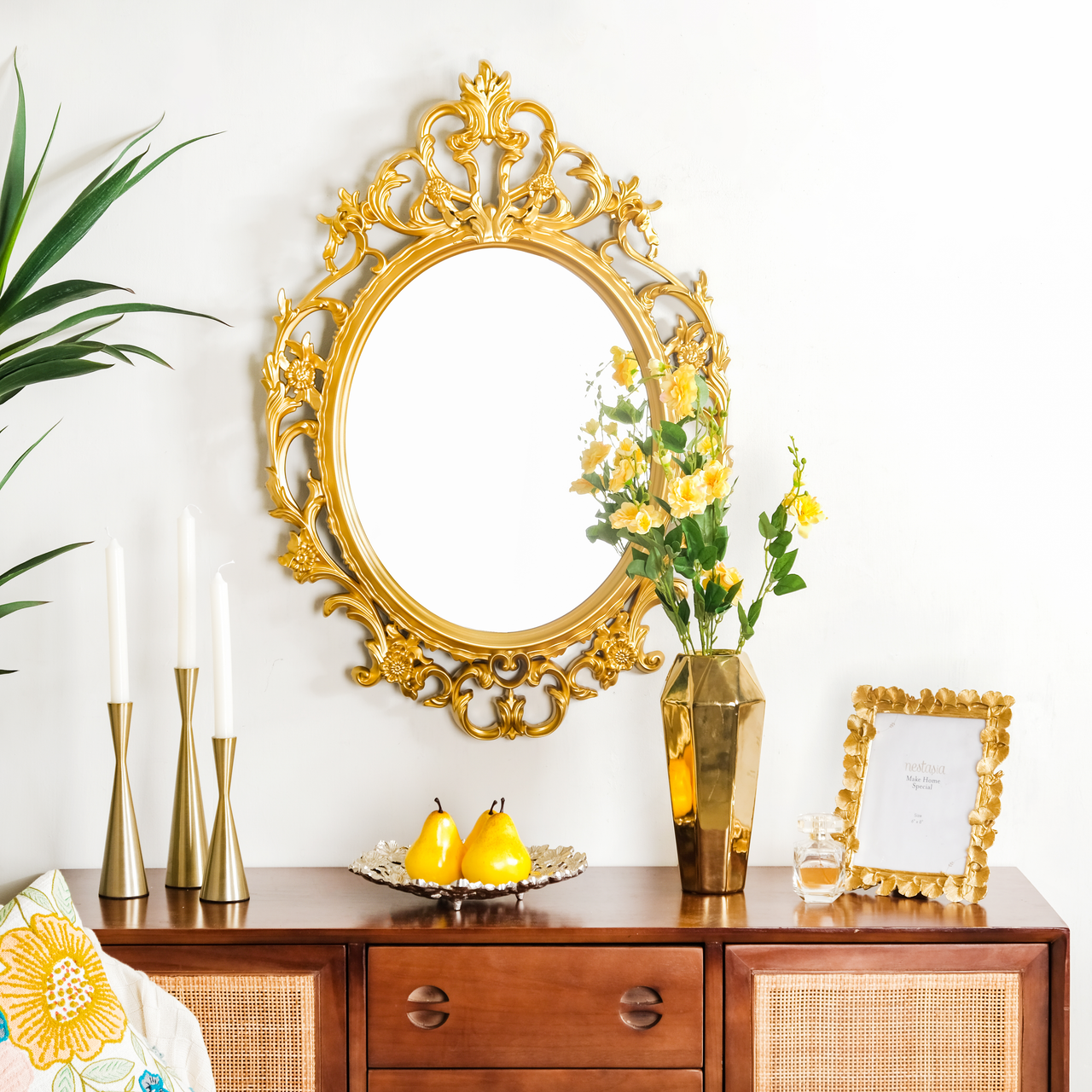 - Vintage Mirrors and Mirrors with Ornate Carvings: The choices for a vintage mirror and mirror with ornate carving that add a regal touch to your setup are plenty at Nestasia. Our elegant designer mirror exudes royalty with exotic gold frames and accents. They accentuate spaces when kept sensibly where there is an abundance of light. The sheer look of our mirrors uplifts any dull corner of your home decor adding a grand touch to it.
