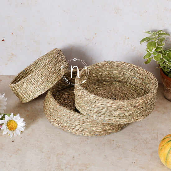Kitchen organization baskets are a set of 3 natural Sabai grass handwoven baskets that can be used as fruit baskets on the dining table or in the kitchen. The versatile baskets can be used for storing vegetables, or as a tray on the side or coffee table to place books and decor pieces. It can also be used as a snack tray for keeping jars of snacks, pickles and munchies.