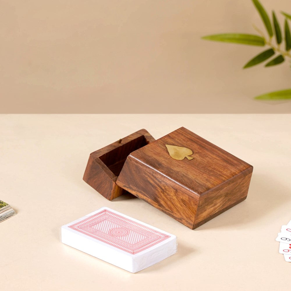 Discover the harmonious blend of form and function with our playing cards encased in a stylish wooden box. Meticulously designed, this versatile box is your go-to solution for storing and protecting the given deck of cards. The hinged top opening ensures easy access while safeguarding your cards from wear and tear. Crafted from premium wood, the box adds a touch of timeless elegance to any gaming space or home decor. Whether you're an avid card player or simply looking to organize your collection, this box offers both utility and style. Its high-quality build, practical features, and aesthetic charm make it an ideal addition to your gaming routine or a thoughtful gift choice.
