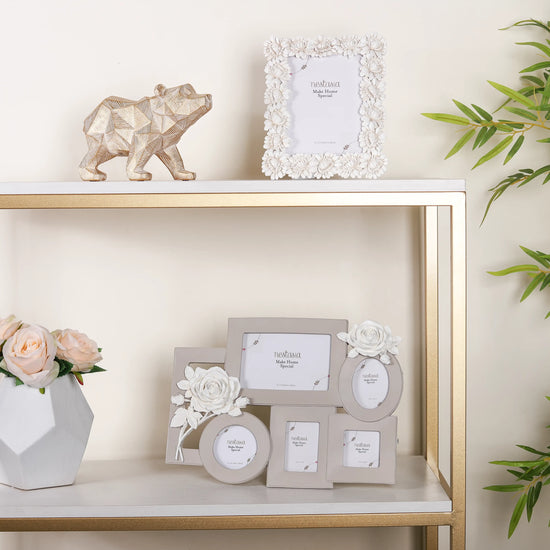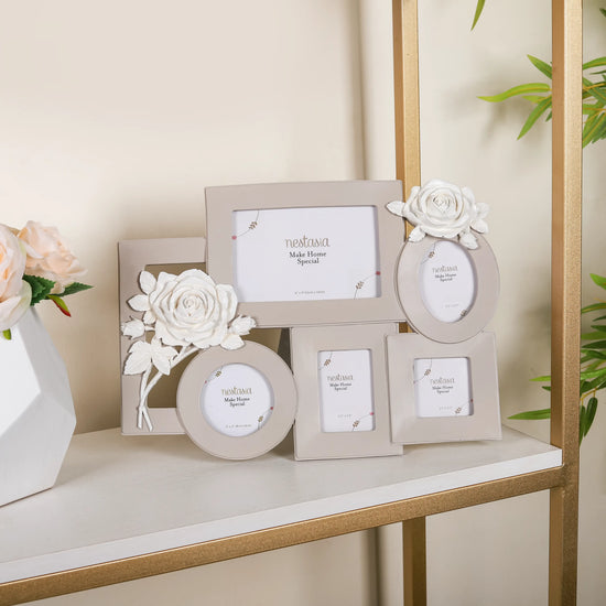 The large stunning wall photo frame is a masterpiece that artfully combines functionality and beauty to showcase your cherished memories. The meticulously crafted frame boasts 5 unique slots, each thoughtfully designed to accommodate various photograph shapes and sizes, including square, round, oval, and rectangle frames, all elegantly finished in a timeless ivory colour.The collage frame can also be placed on the table and comes with a back stand. The focal point of this captivating frame is its two exquisite 3D motifs of blooming roses, gracing each side with an enchanting touch. Whether displayed in your living room, bedroom, or office, this photo frame will undoubtedly become a cherished centrepiece, preserving your precious moments in a captivating and sophisticated manner.