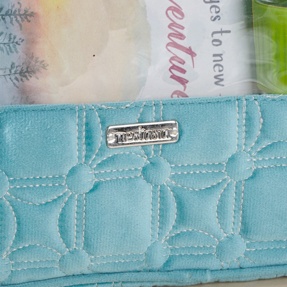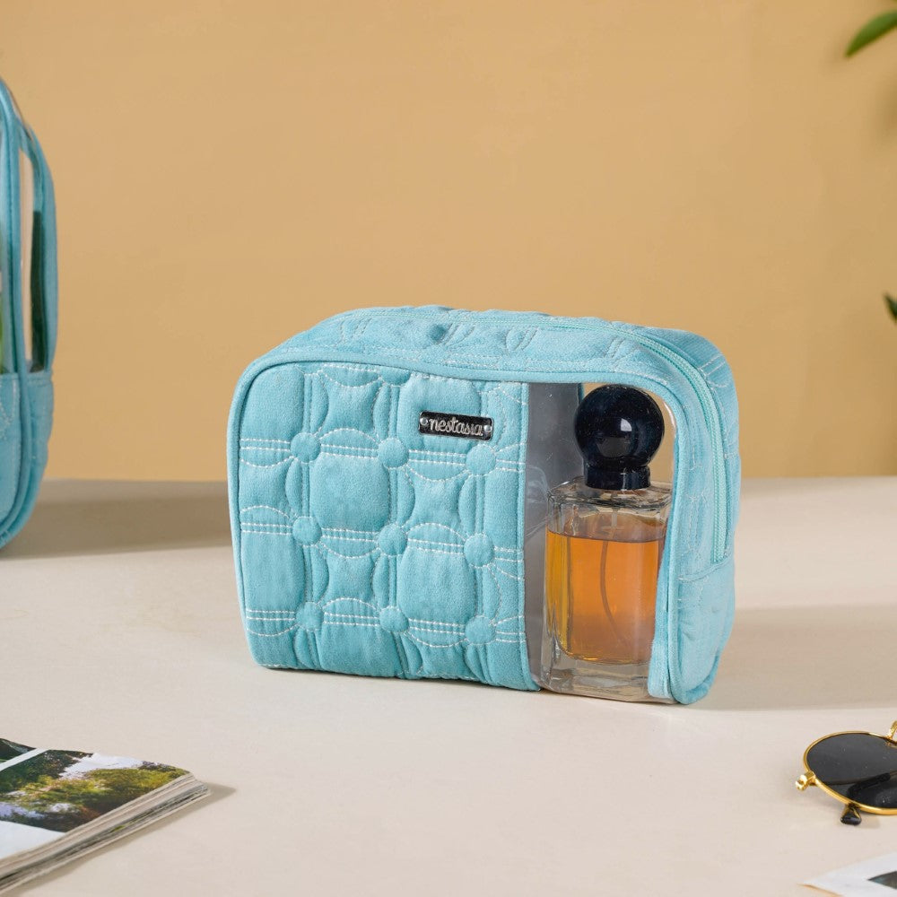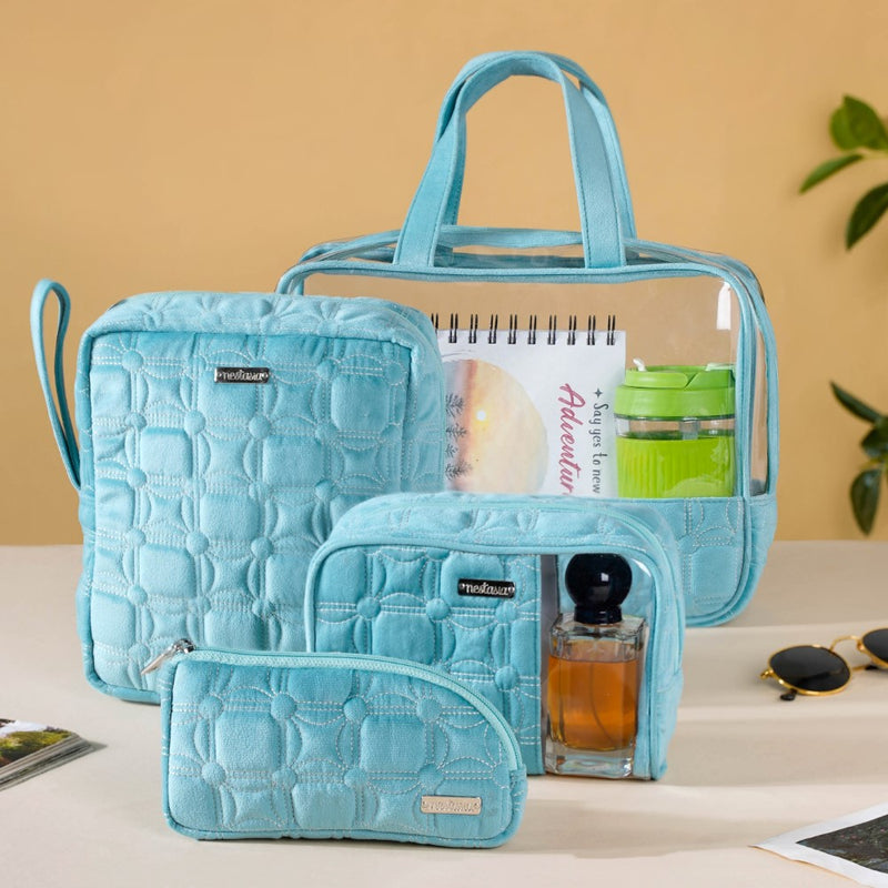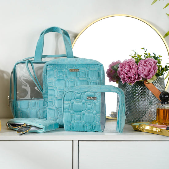 Crafted from premium quality velvet material, this blue travel pouch kit features four pouches of different sizes, tailored to meet your travel storage needs. Indulge in the plush touch of velvet as it cradles your belongings, keeping them safe and secure throughout your adventures. Whether it's jewelry, accessories, cosmetics, or small essentials, these pouches provide a chic and practical solution. With their compact design, they effortlessly slip into your luggage, making them essential companions for jet-setters and weekend explorers alike.