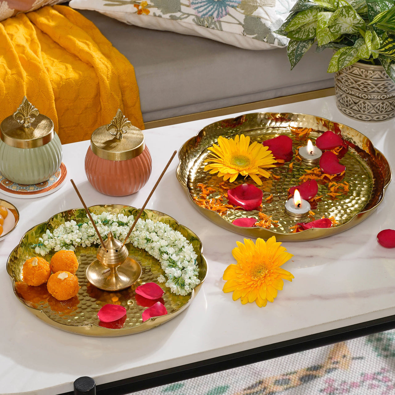 These aluminium puja thali urli platters, decorative platters, golden plate & decorative plates are available in sets of 2 and 3, offering versatility and flexibility in their usage. The golden plate sets can be arranged in various configurations, allowing you to create visually stunning displays in different areas of your home. Whether used as a centrepiece on a dining table, puja thali/ pooja plate displayed on a console table, or arranged on a mantelpiece, the golden plate sets of urli platters add a touch of elegance and become a focal point of attention.