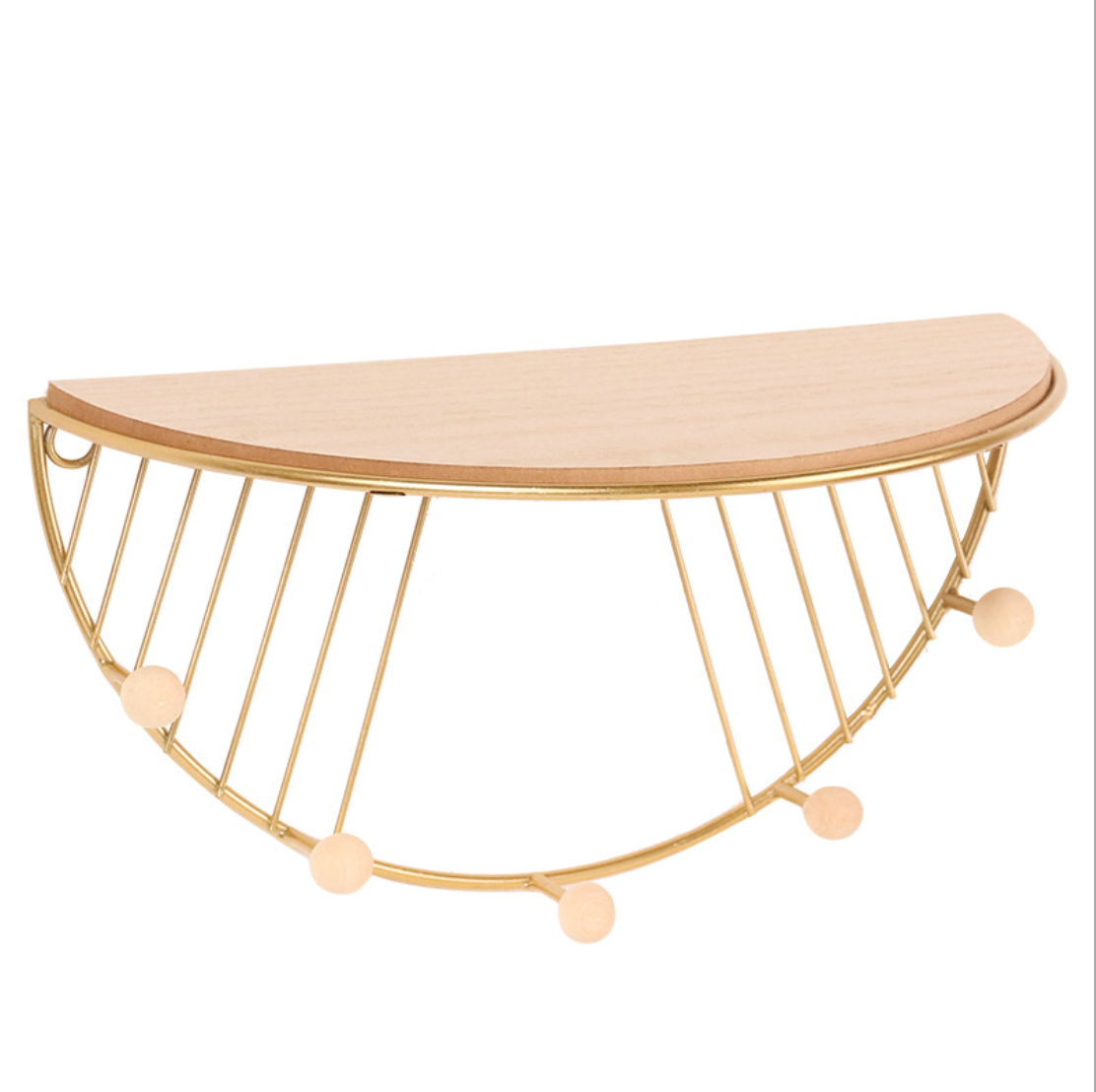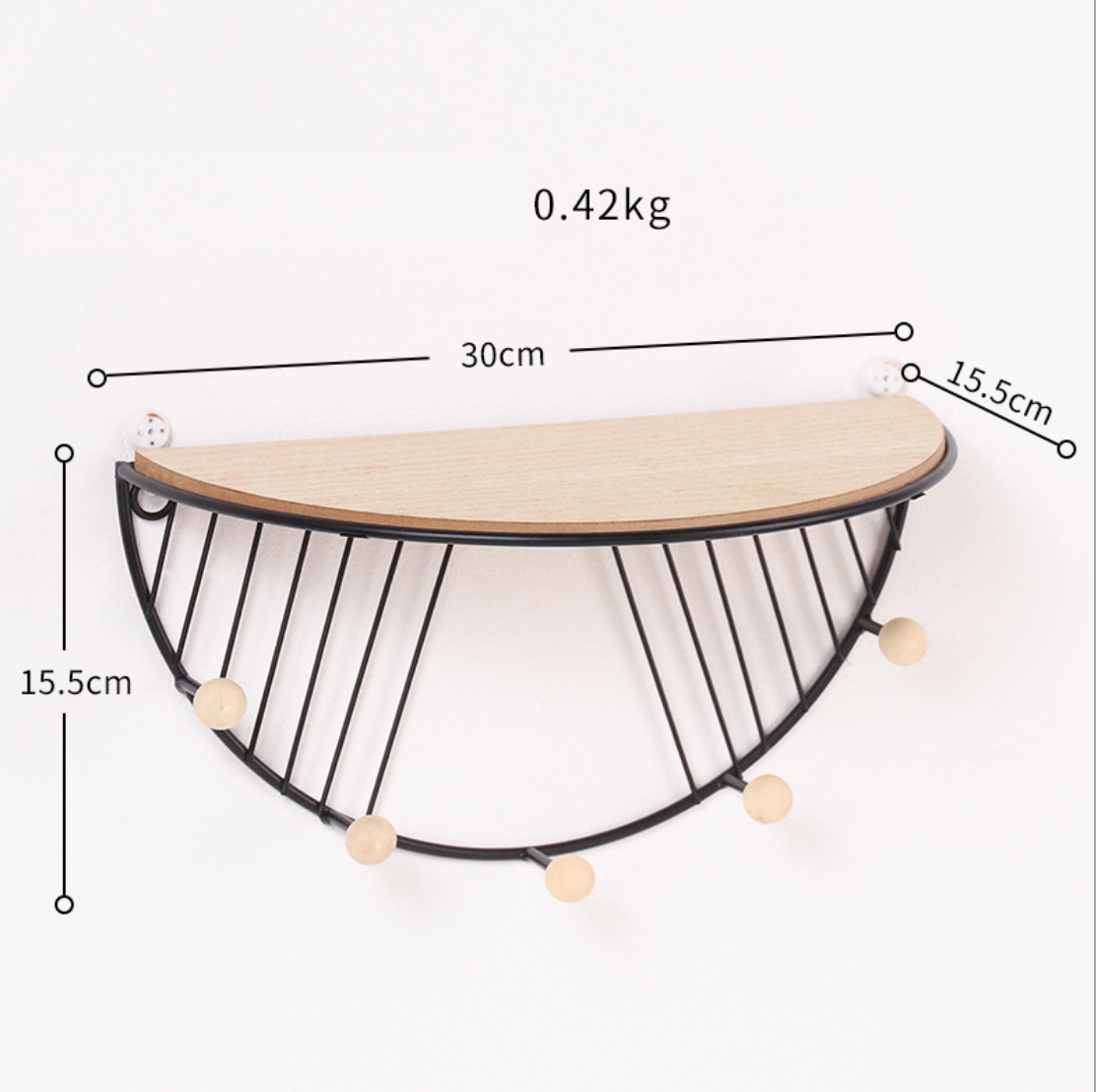 A wall mounting shelf with a wooden rack and 5 hooks attached to the metal frame. The shelf has a warm homely design which can be topped with show pieces or planters and the hooks can be used for hanging keys, bags, hats or linens.The frame can be mounted on the wall in a bedroom, living room or even a bathroom.