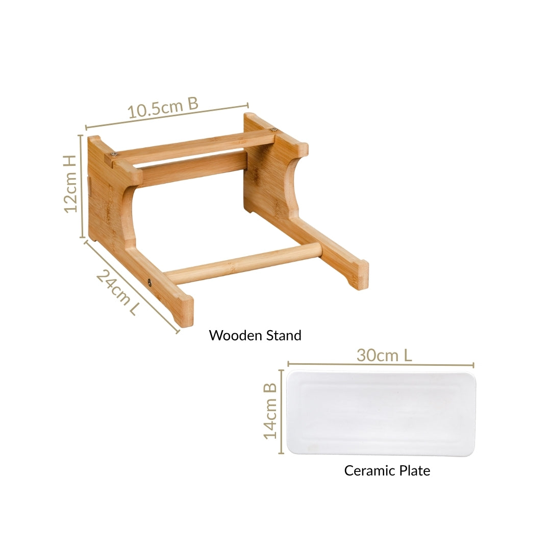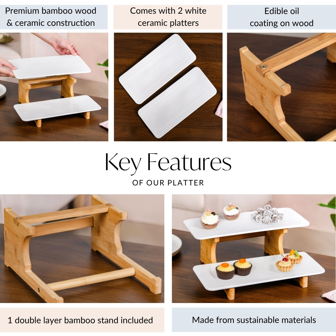 Premium bamboo wood & ceramic construction Comes with 2 white ceramic platters Edible oil coating on wood 1 Double Layer Bamboo Stand included Made from sustainable materials