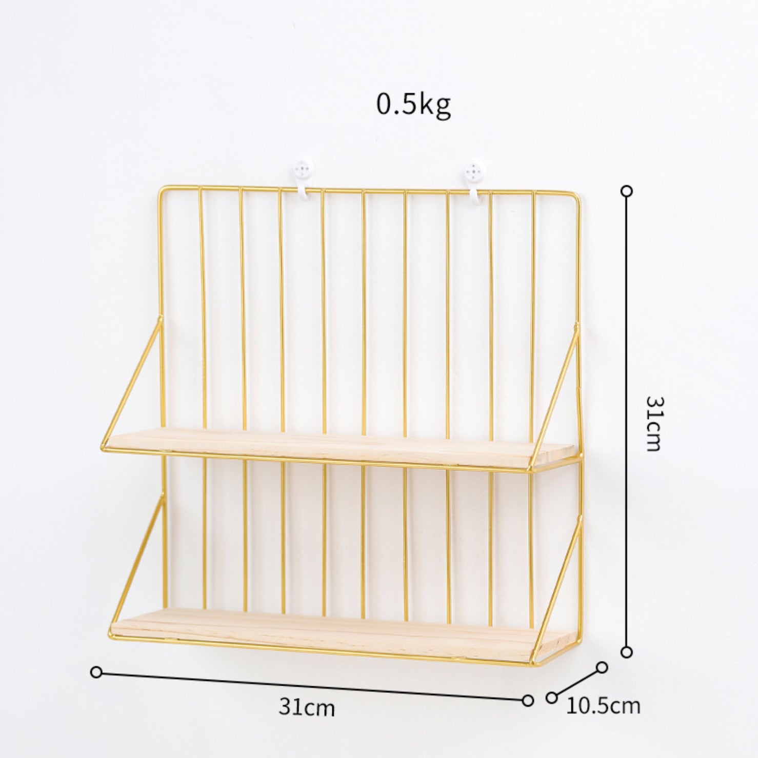 The rectangle two tier wall shelf with vertical lines can be wall mounted or placed on a table or plank. The wall racks are made of metal wire with floating wooden shelves and can be placed in the kitchen, office, study, or even restrooms to arrange flowers, planters and utilities. Place a table calendar, table clock, showpieces and ornaments on the rack to make a wall look exciting.Nestip: Arrange pots and planters with greens on the shelf to create a green cornerSize: 31x31x10.5cmMaterial: Metal and WoodColour: black, goldItems included: 1 wall shelfStyle Number: Gold - ZHL20FCN08 Black - ZHL20FCN09