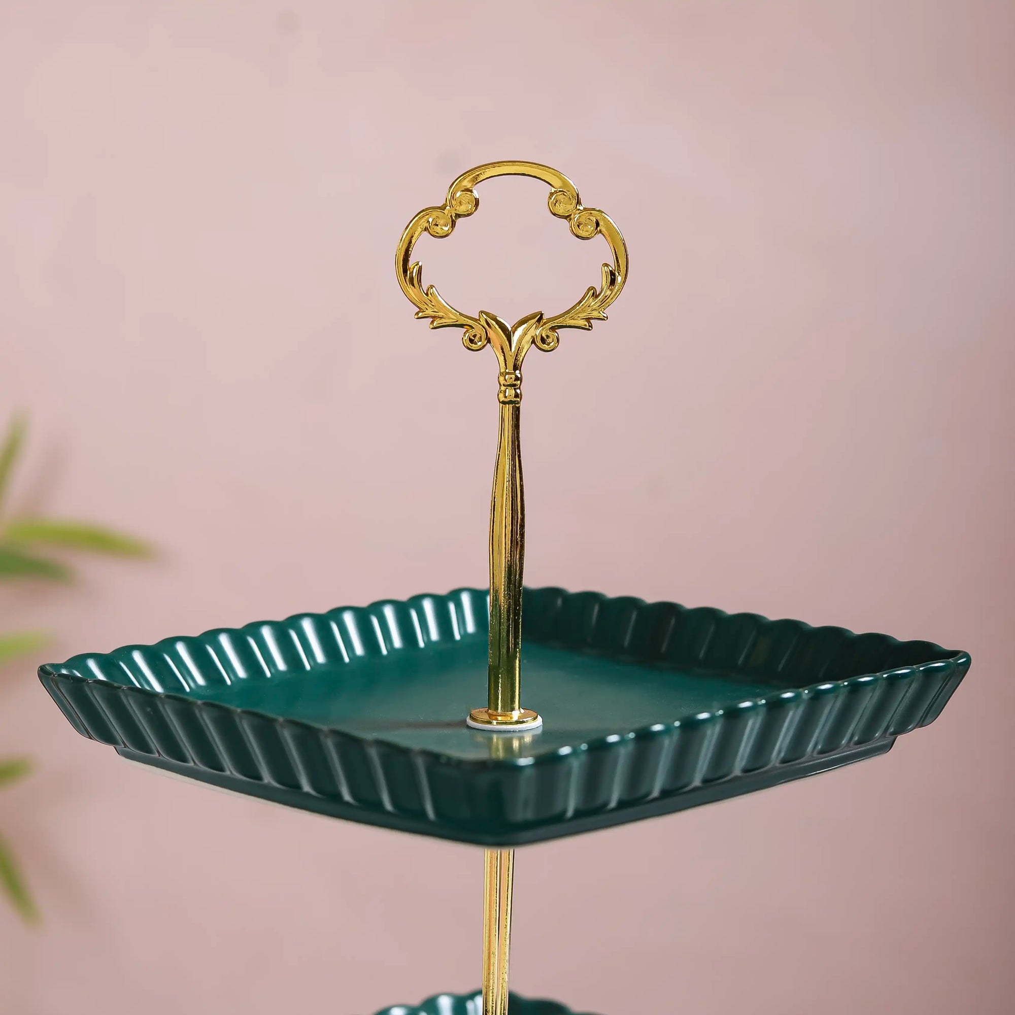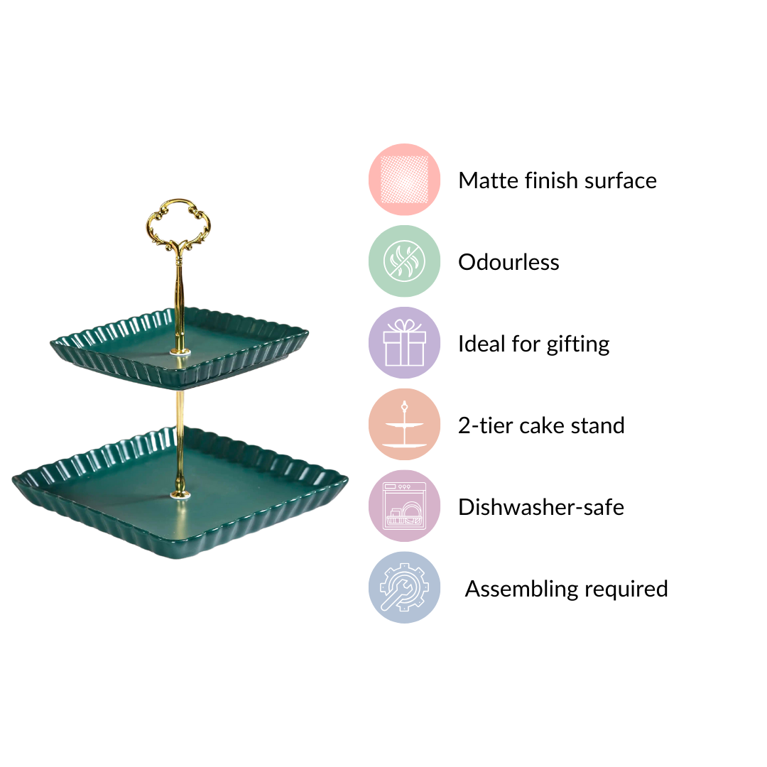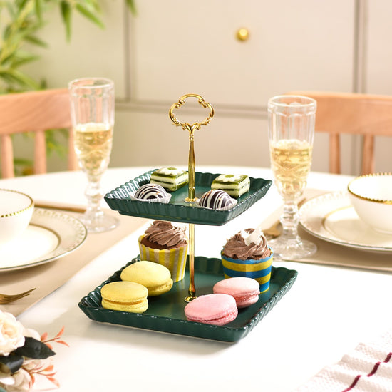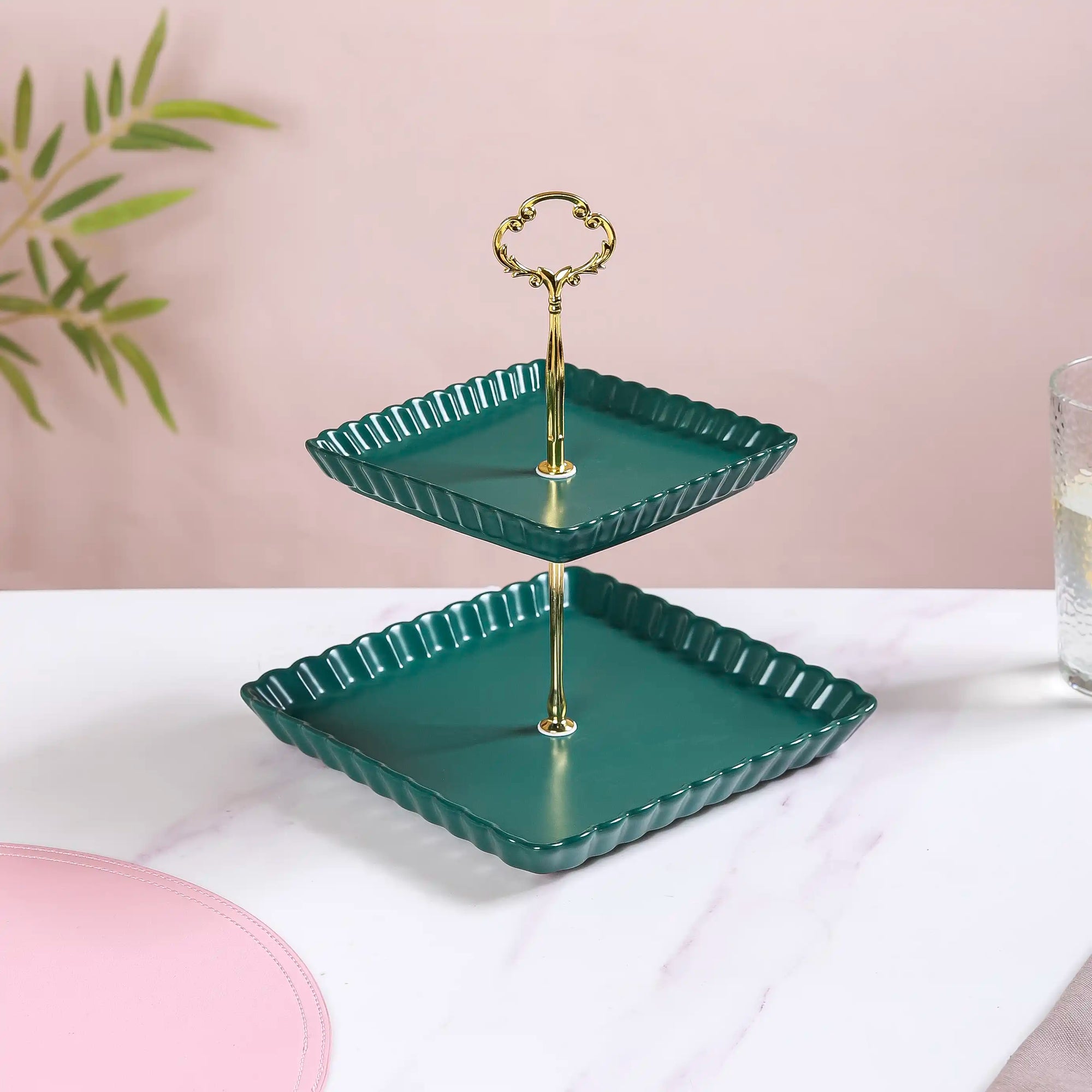 The ceramic snack stand features an elegant and eye-catching design that adds a touch of sophistication to any table setting. Its vibrant green color and two-tier structure make it a stylish and decorative piece. The two-tier design makes it versatile, allowing it to be used for presenting a variety of desserts, pastries, appetizers, or other treats. This versatility appeals to a wide range of recipients with different culinary interests. Therefore this green square ceramic cake stand's an ideal choice for gifting, suitable for various occasions and recipients.