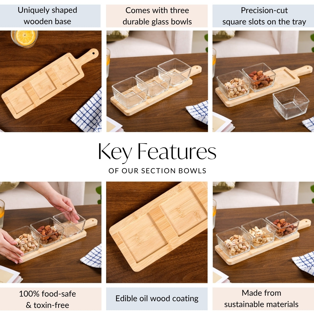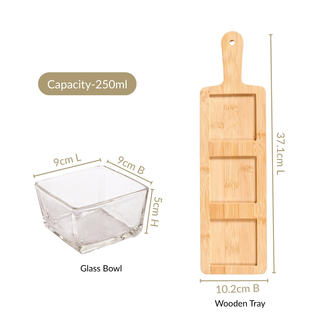Benefits: Experience complete peace of mind and effortless entertaining with this exceptional set. Each component is 100% food-safe and toxin-free, ensuring a healthy and secure presentation for all your edibles. The durable glass bowls are easy to clean and maintain, while the sustainably sourced wooden base adds an organic touch to your decor. This thoughtfully designed set ensures your snacks, condiments, or ingredients are always presented with impeccable organization and refined style.