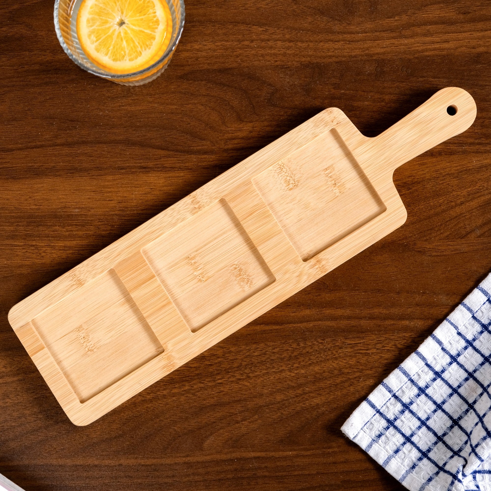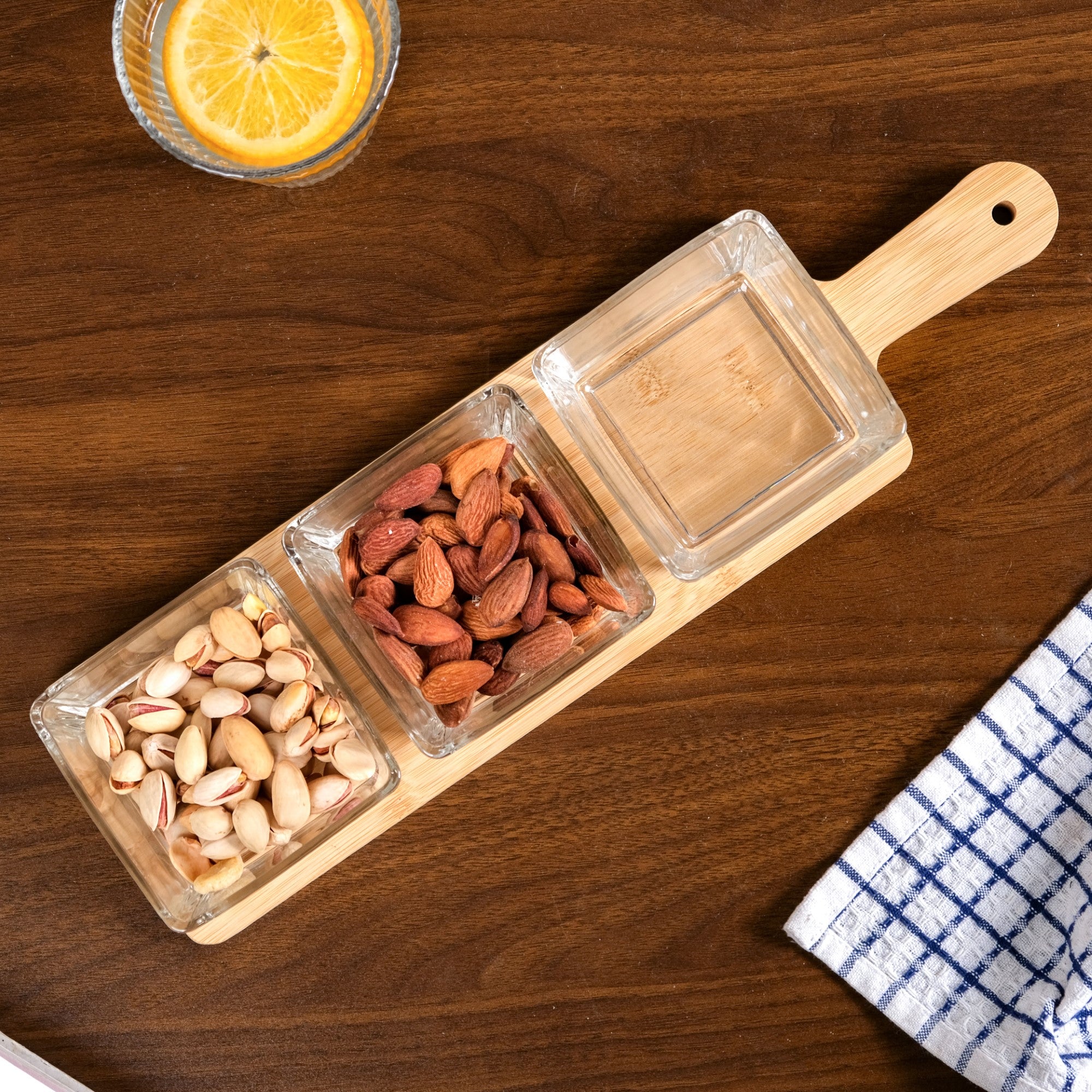 Design: At the heart of this set lies its uniquely shaped bamboo wood base, crafted from sustainable materials and reminiscent of a sophisticated serving paddle, complete with a convenient handle. This robust base features precision-cut square slots on the tray, designed to perfectly cradle the three accompanying durable soda lime glass bowls. These elegantly square-shaped bowls fit snugly within their dedicated slots, ensuring stability and a streamlined appearance. The wooden base is further enhanced with an edible oil wood coating, which not only brings out the rich, natural grain of the wood but also provides an added layer of protection and a subtle sheen. For long-lasting use, wipe with a damp cloth and let it air dry.