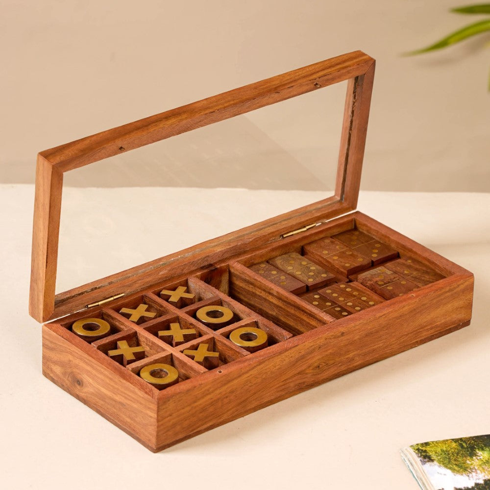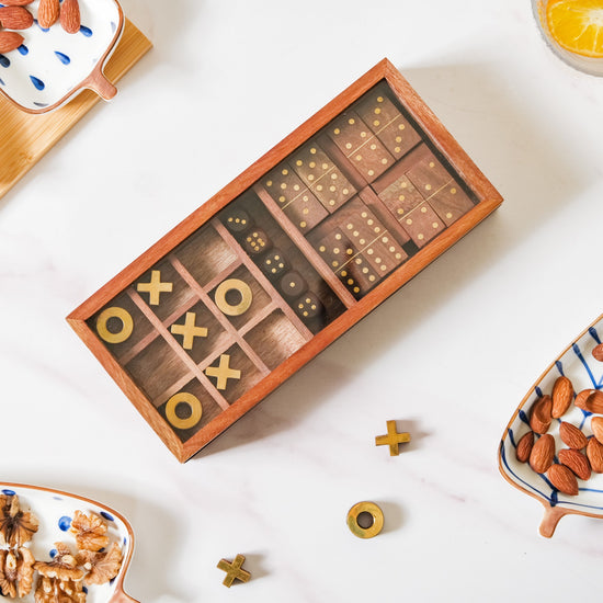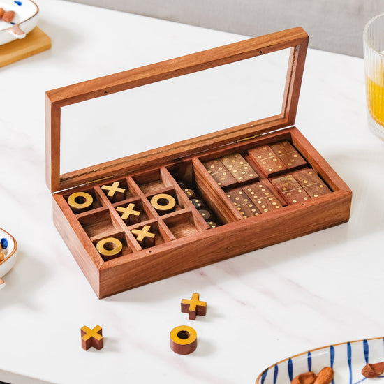 The Multi-Game Box offers a trio of classic games: Tic Tac Toe, wooden dominoes, and wooden dice. These timeless games are thoughtfully selected to provide versatile entertainment options that cater to various preferences, making the box an all-in-one solution for a range of gaming experiences.