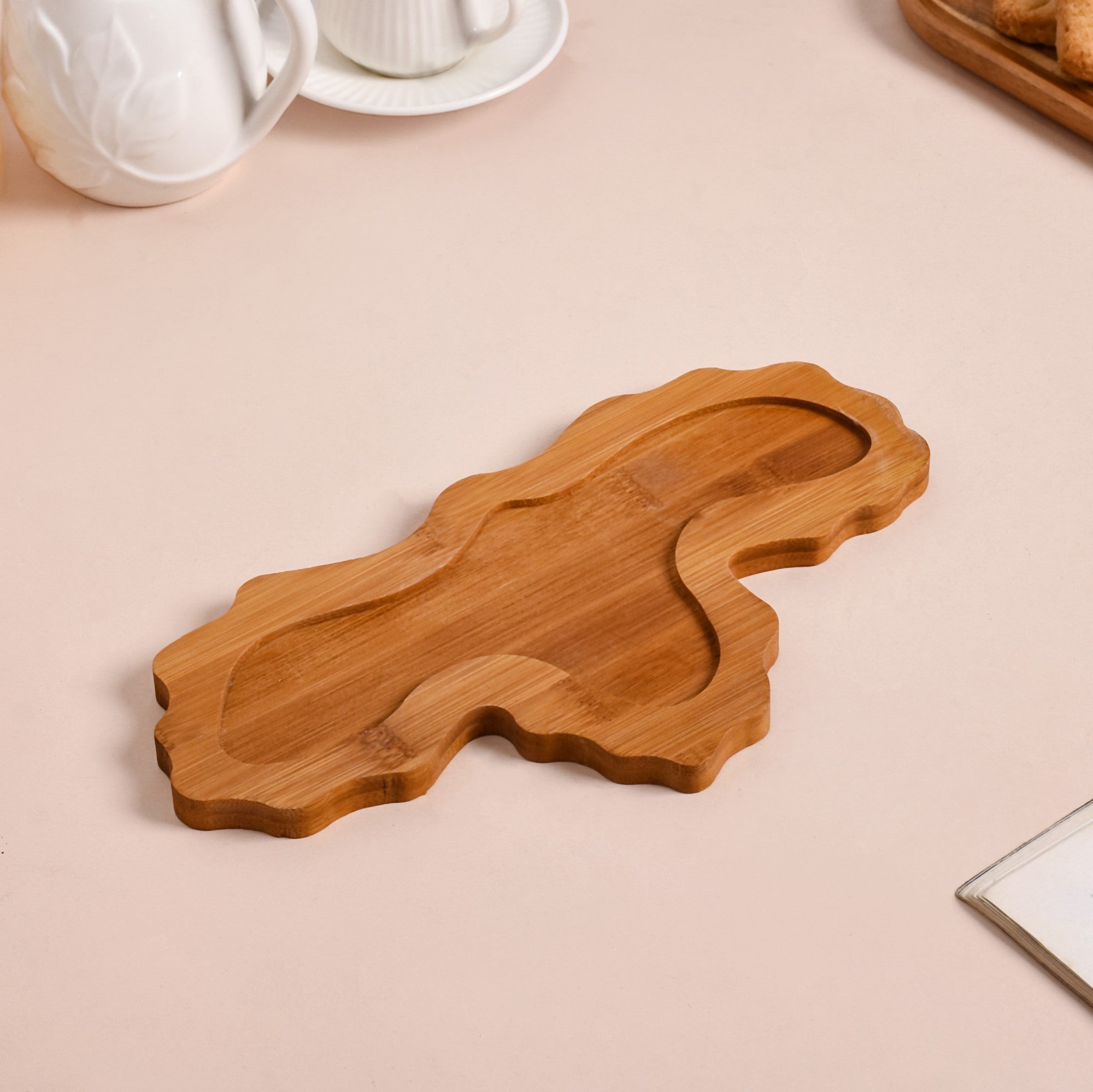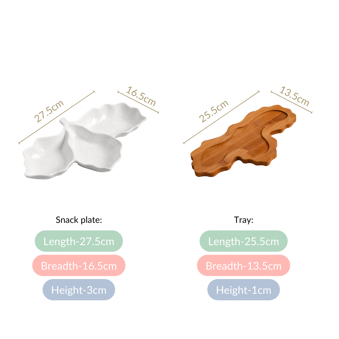 Design: The section plate features a unique leaf shape with intricately detailed leaf vein designs, adding a touch of nature-inspired charm to your table setting. It is divided into three distinct sections, allowing for a versatile presentation of your favourite dishes. The ceramic plate rests on a natural wooden tray, which enhances its aesthetic appeal while providing a sturdy base.