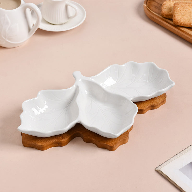3 Section Leafy Ceramic Plate With Wooden Tray