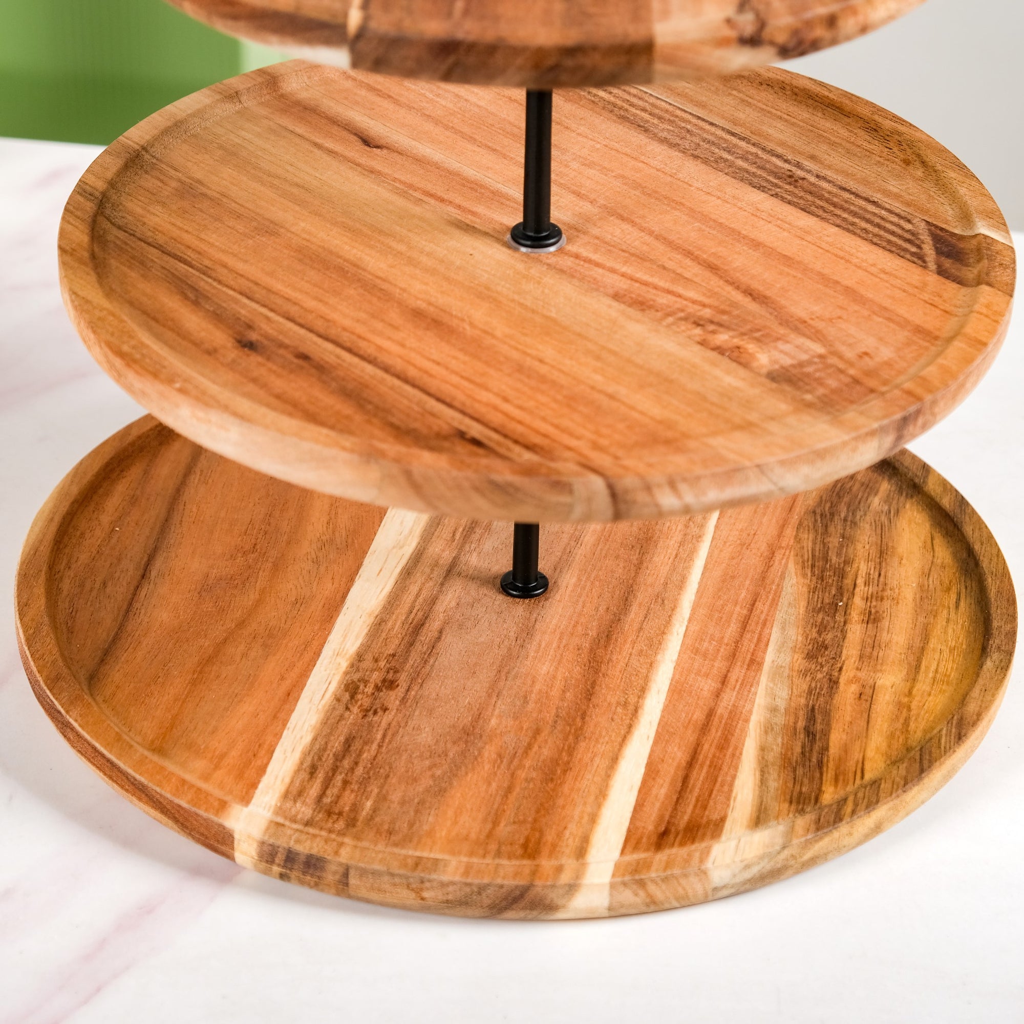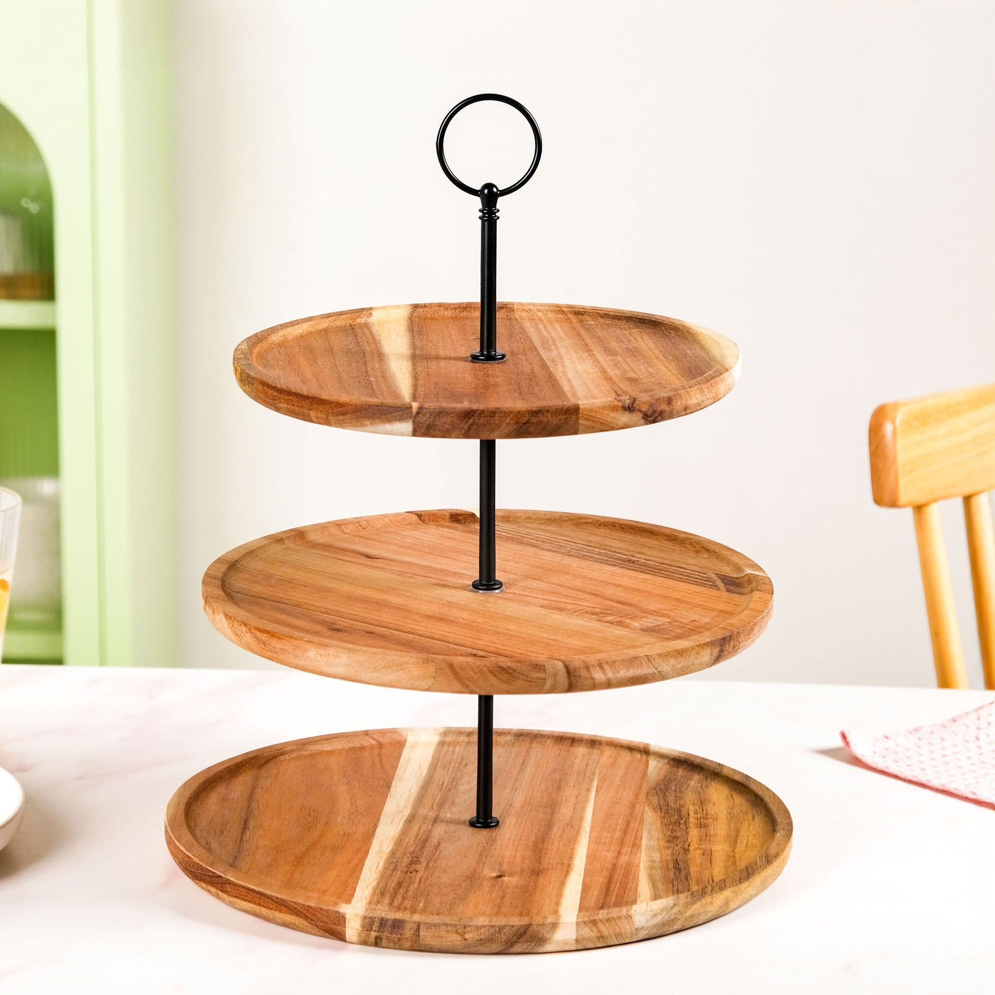 Design: Crafted from richly grained acacia wood, this 3-tier cake stand showcases natural warmth and elegance in every layer. Each of the three circular trays features smooth, slightly raised edges that help keep items securely in place. The wood displays beautiful tonal variations, with streaks of caramel, honey, and chestnut that add visual texture. The tiers are supported by a sleek black metal rod with a circular loop handle at the top for easy lifting and transport. The stand requires simple assembly - just align, secure, and stack. Its earthy, contemporary look makes it suitable for both casual and formal settings.