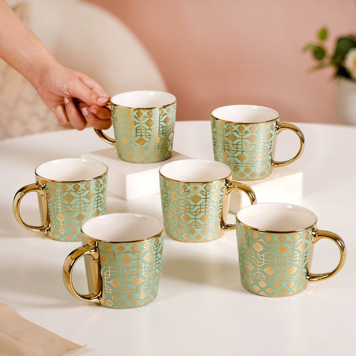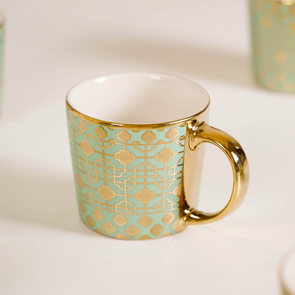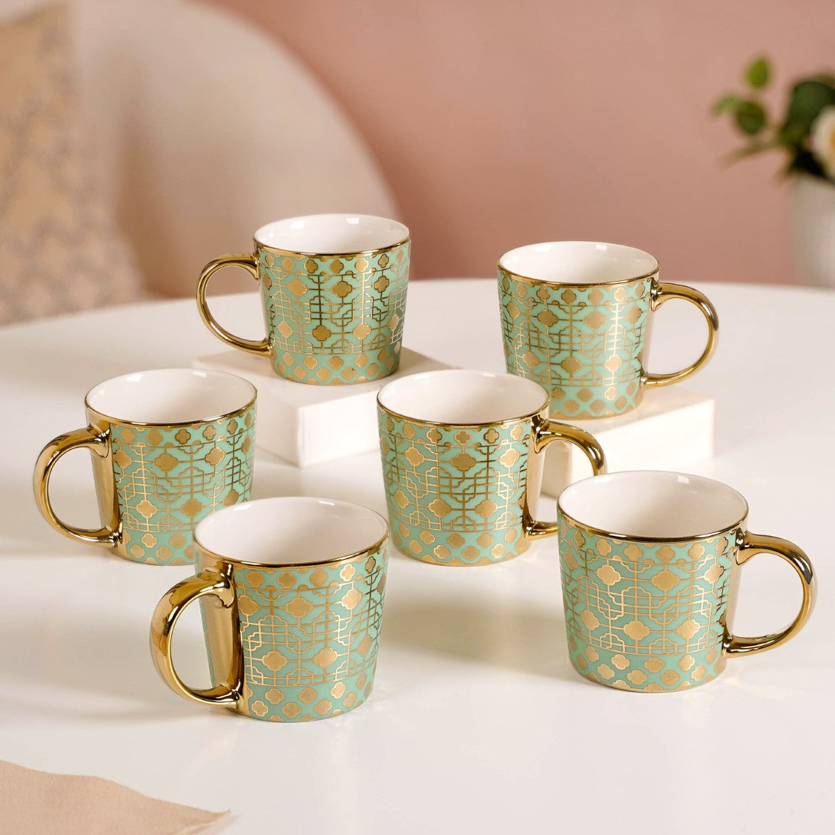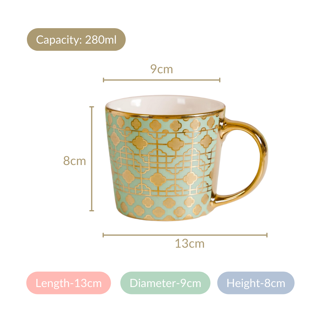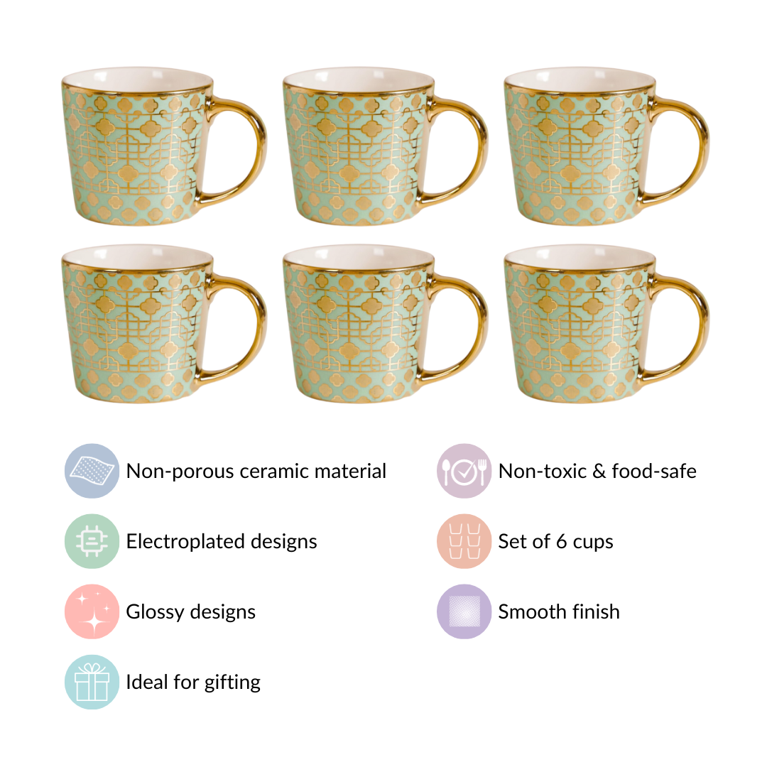 Step into a world of opulence with our exquisite ceramic mug set, boasting six cups of the same alluring hue and design. Each cup in this set is a true masterpiece, expertly carved using cutting-edge electroplating technology to bring out the 3D intricate geometric patterns. Adorned with a gleaming golden rim and a sturdy C-shaped handle, these electroplated ceramic cups are designed to enhance your tea or coffee time experience. Whether it's your daily ritual or a special occasion, our cup set effortlessly infuses an element of sophistication into every sip.