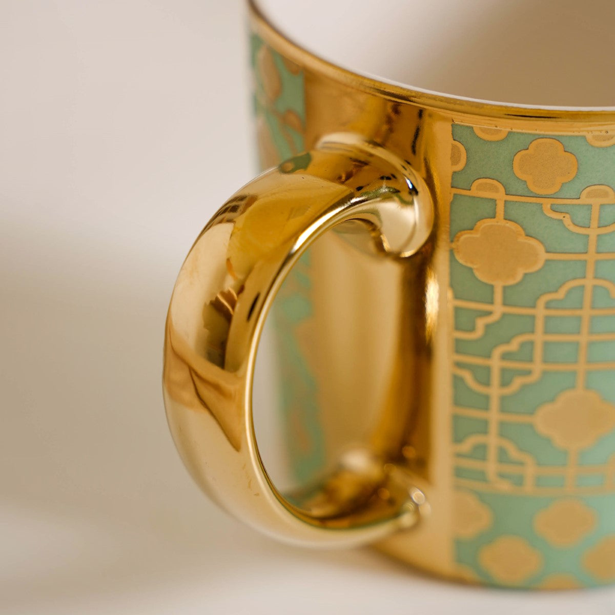 Each cup in the set features captivating 3D intricate geometric patterns that have been meticulously created using advanced electroplating technology. These patterns add depth and a sense of opulence to the cups, making them truly unique. Surrounding the top edge of each cup is a lustrous golden rim. This elegant detail not only enhances the visual appeal of the cups but also adds a touch of luxury to your tea or coffee experience. The cups are equipped with a durable C-shaped handle, designed for a convenient and comfortable grip. This handle adds to the overall functionality of the cups and makes them easy to hold.