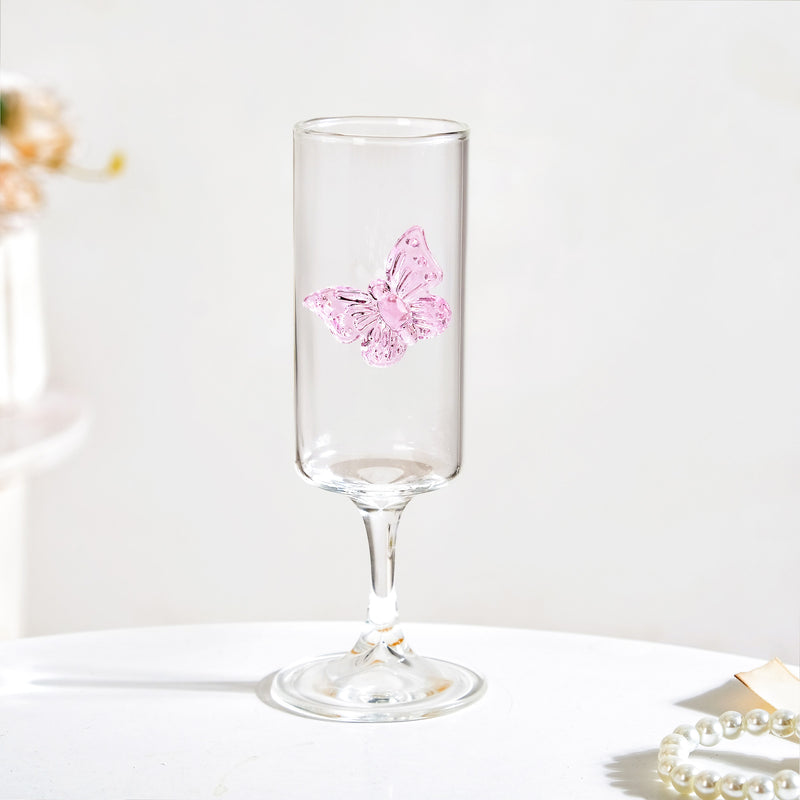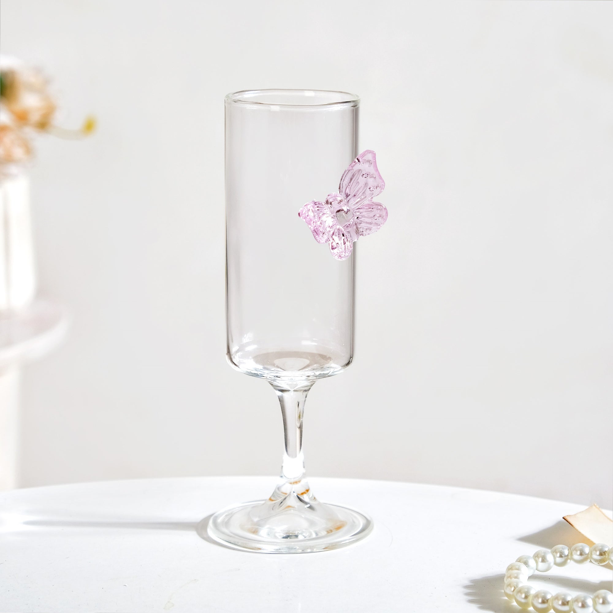 Design: Handcrafted from clear borosilicate glass, this flute features a smooth, seamless silhouette for a refined, modern appearance. The highlight is a blush-pink butterfly sculpted from textured borosilicate glass, delicately perched at the center. With its soft tint and intricate detailing, the butterfly brings a dreamy, whimsical charm to the overall design.