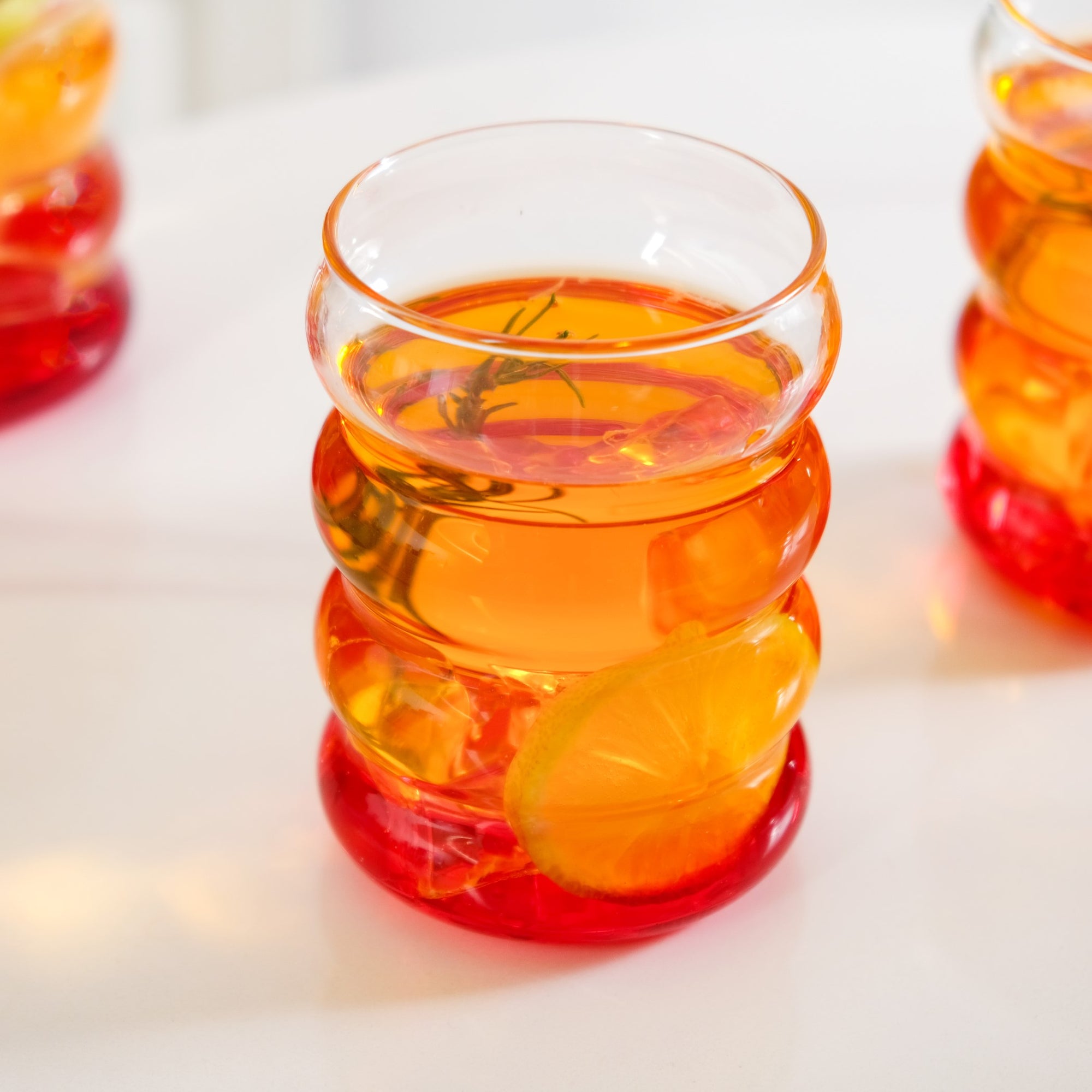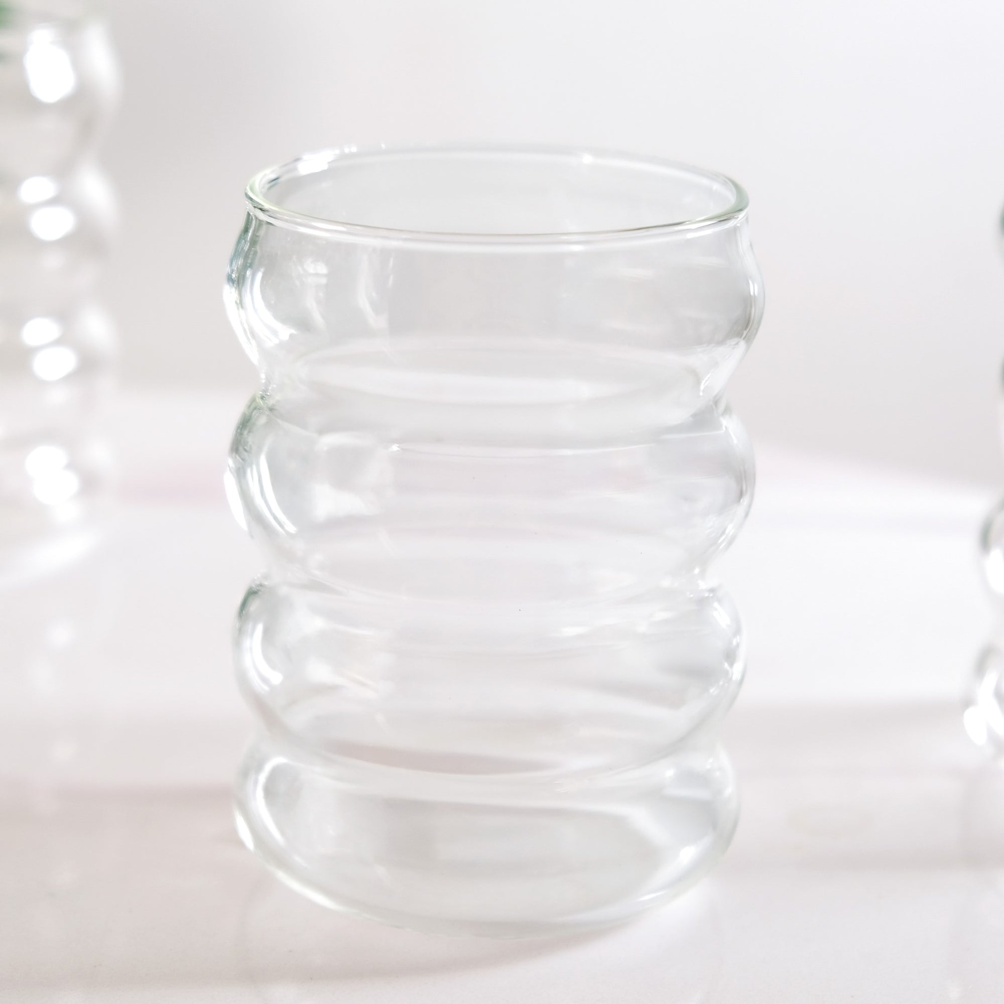 Design: Each piece is hand-blown from high borosilicate glass, ensuring unmatched clarity and finesse. The glasses feature a smooth outer texture that feels luxurious to the touch. Designed with a flat base, they stand stable and strong on any surface. The unique caterpillar silhouette brings sculptural drama to your drinkware. This set includes four glasses, crafted to turn every drink into a visual treat.