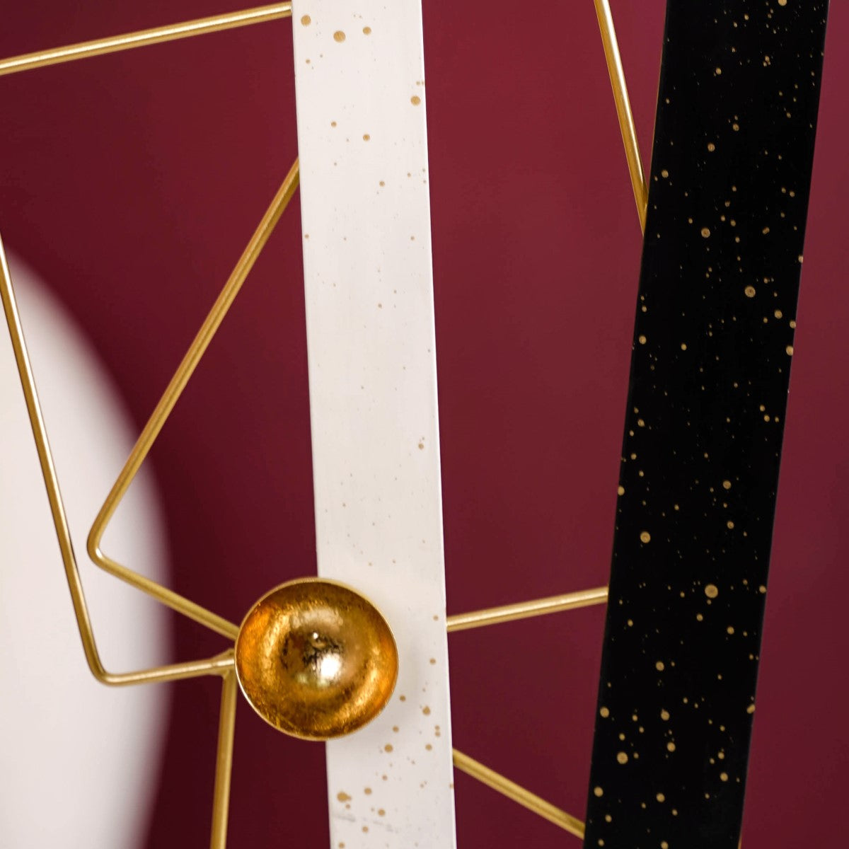 A sturdy metal stand supports an array of overlapping geometric metal accents that rest on top. Integrated into the design for structural stability and support, the stand is detachable.