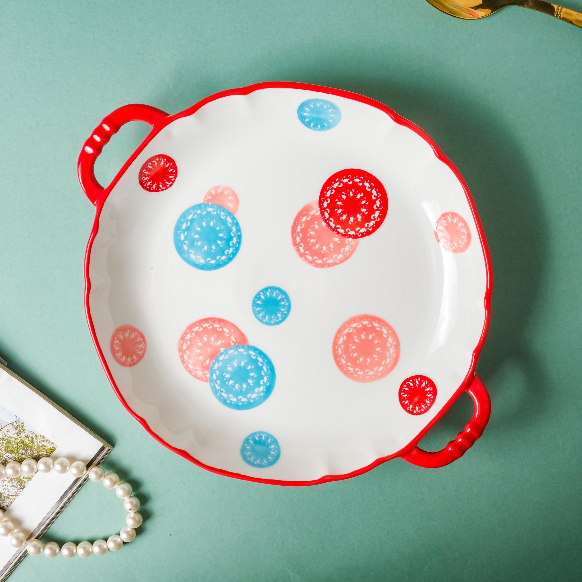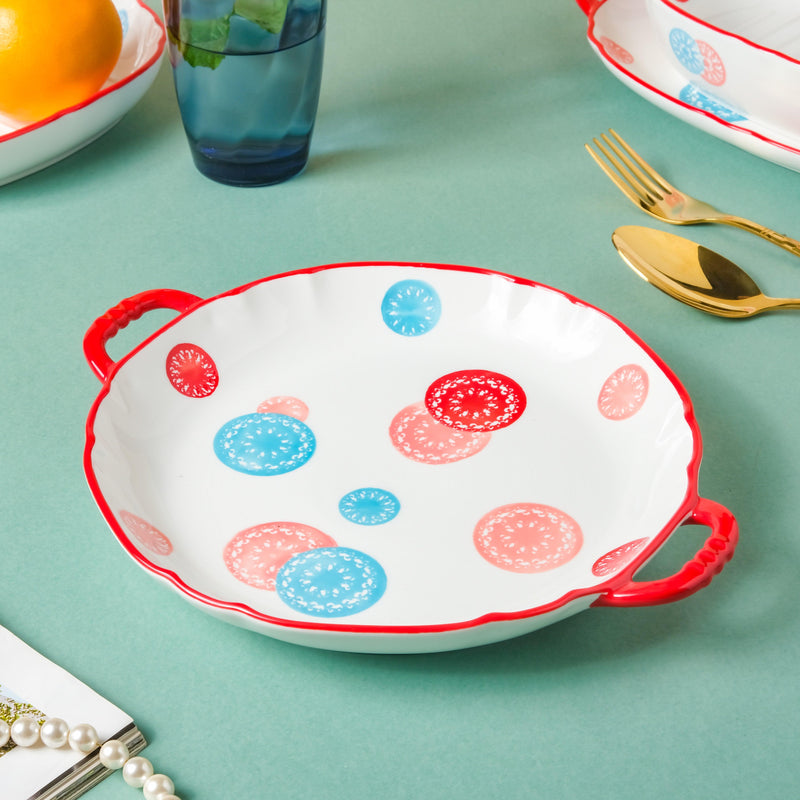 The ceramic tray comes with handles that make it easy to hold and serve. Serve dishes like au gratin, baked potatoes, mushrooms, veggies, bacon and chicken, mud pie, cookies, brownies or one can simply use the tray with handle to serve snacks and sides. The tray is circular in shape and has colorful motifs on the surface that make the tray look eccentric than others.