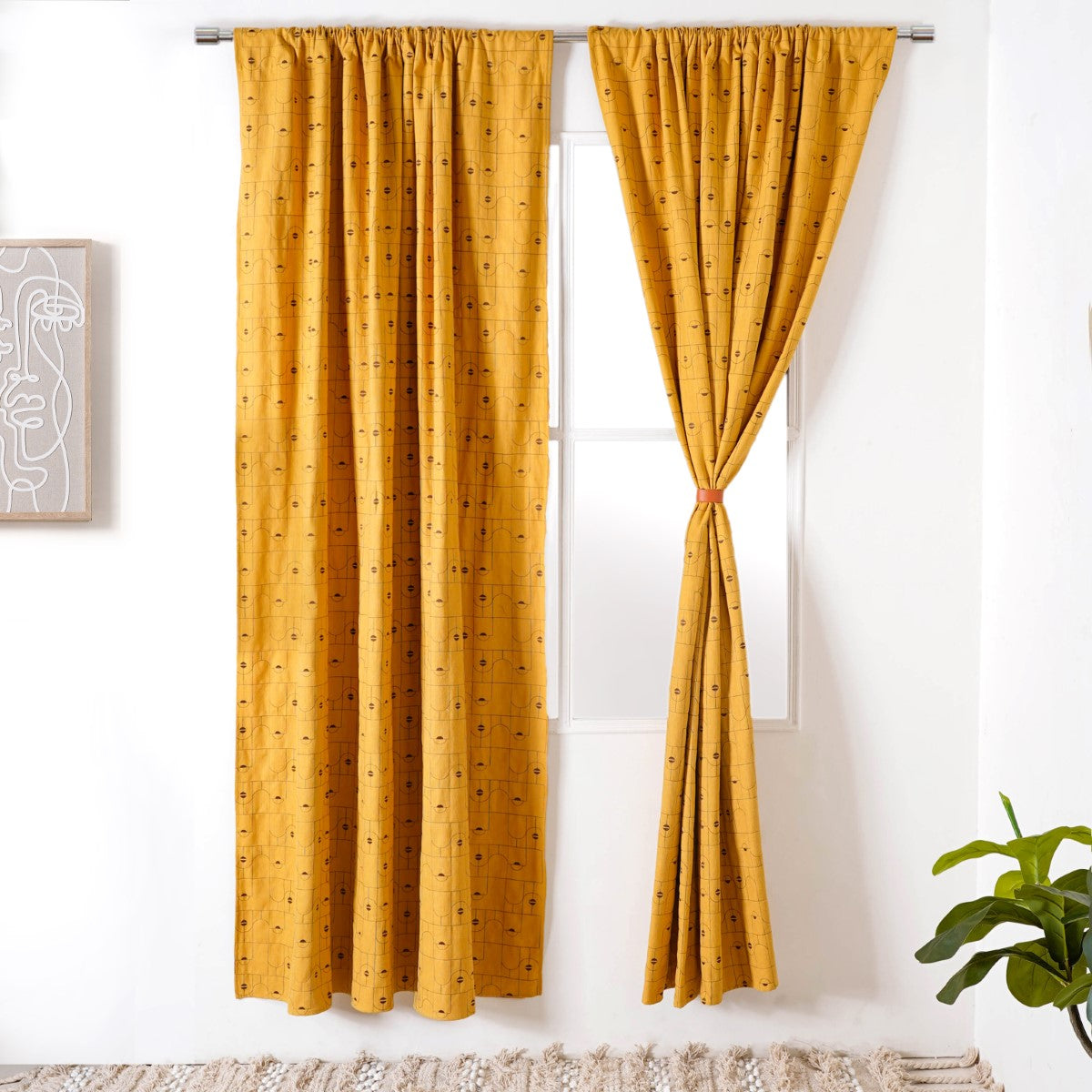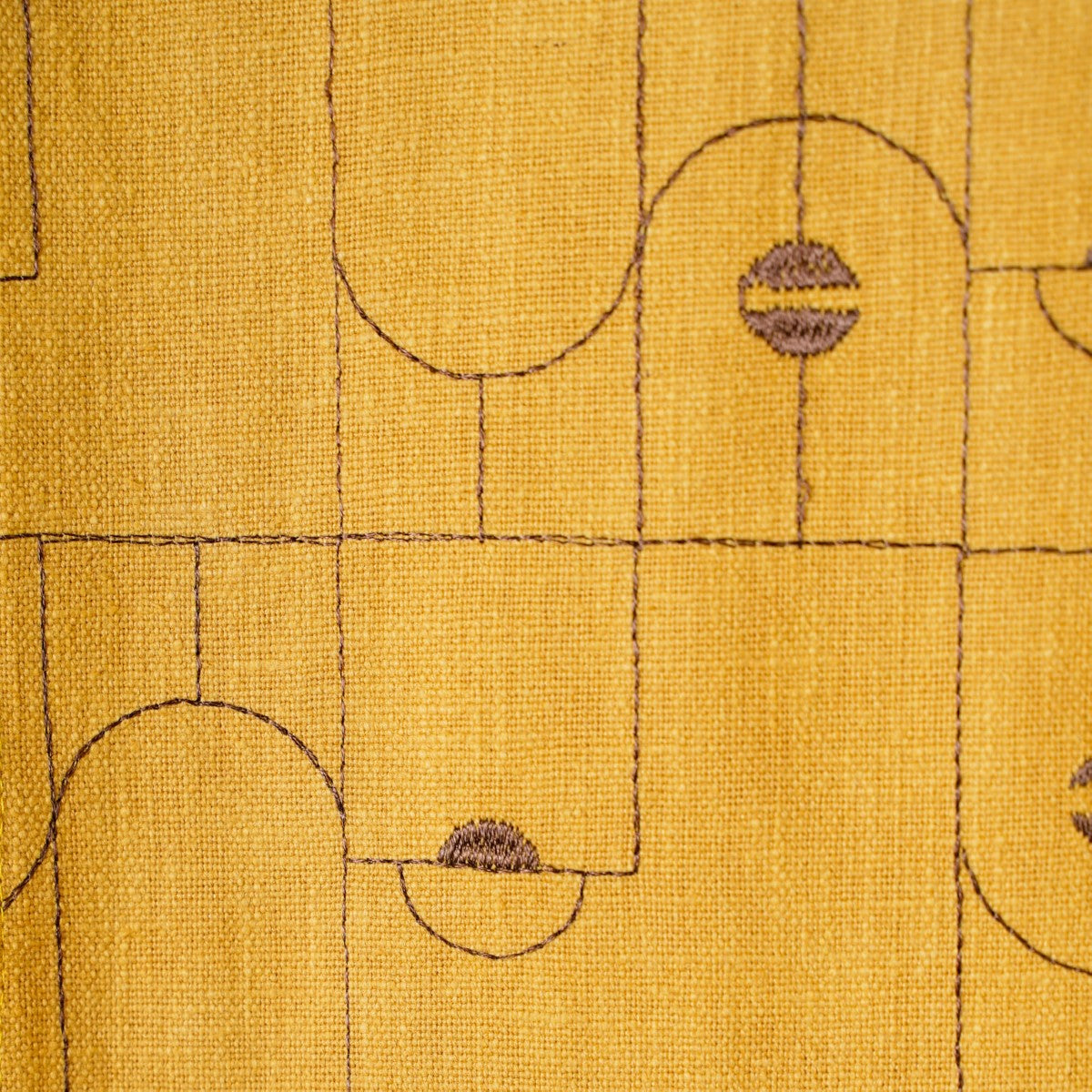 Certainly! The full-length curtains boast a warm mustard yellow colour and embroidered stitchwork, showcasing a wavy block design. Equipped with rod pockets and loops for effortless hanging, it is ideal for recipients with an open floor plan who can use the curtains to elegantly segregate living spaces.