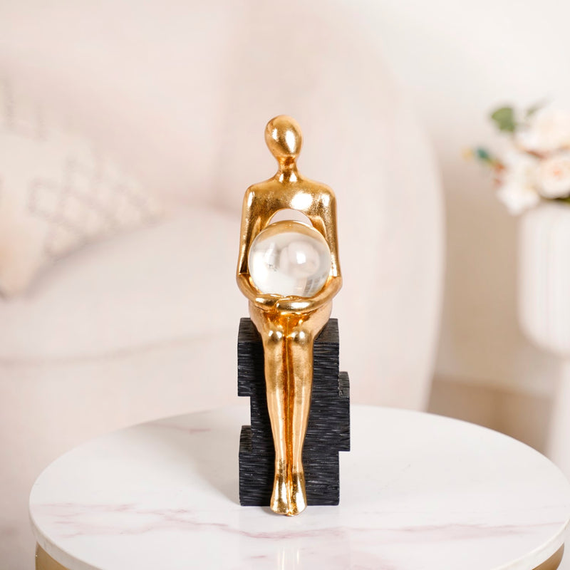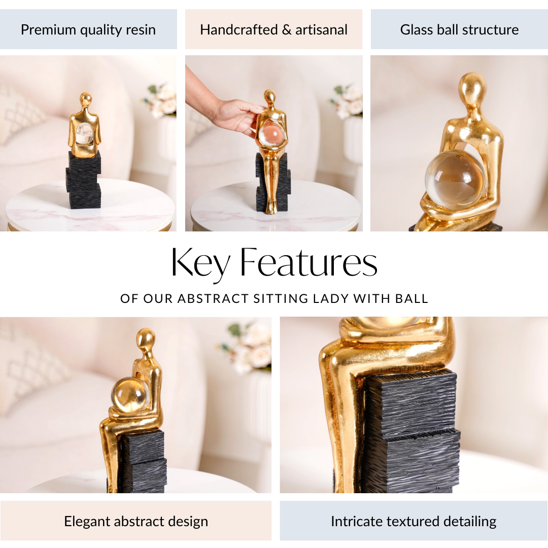 The design and significance of this decor object can be interpreted in several positive ways. The poised posture of the lady and the delicate glass ball symbolize grace, strength, and resilience, making it a powerful affirmation of these qualities in your space. The glass ball adds an element of mystery and ethereal charm, often believed to bring wonder and positive energy, fostering creativity and inspiration. The refined black and gold design exudes elegance and sophistication, reflecting an environment of beauty and refinement in your home.