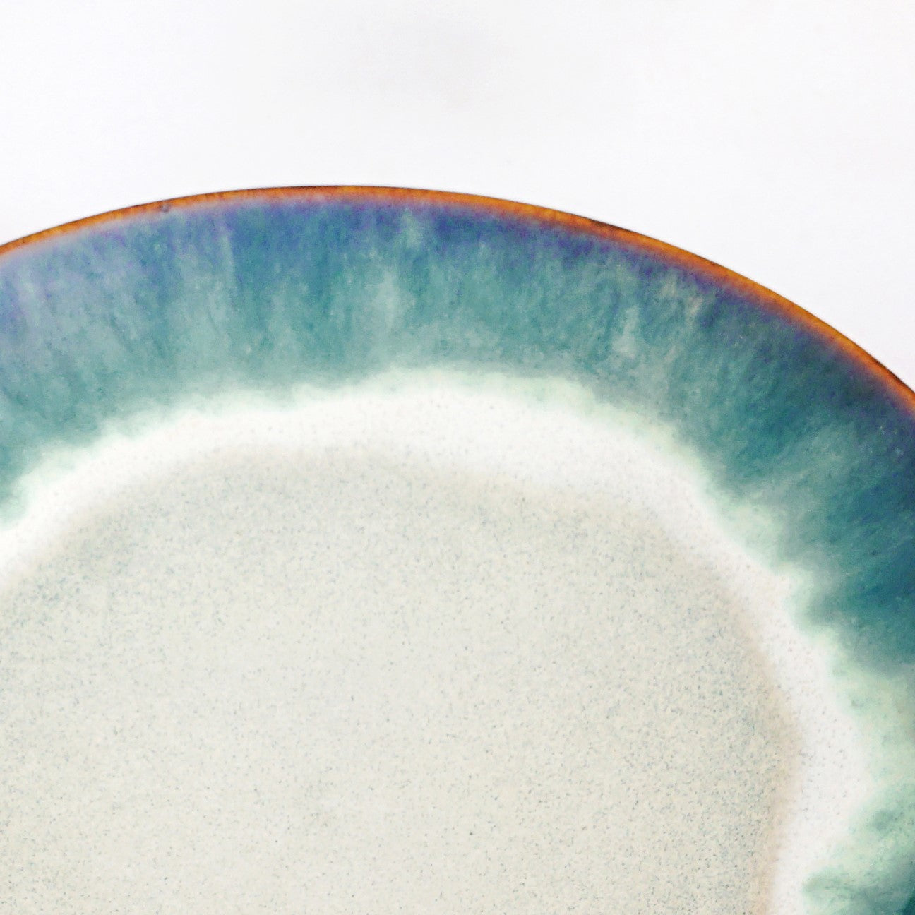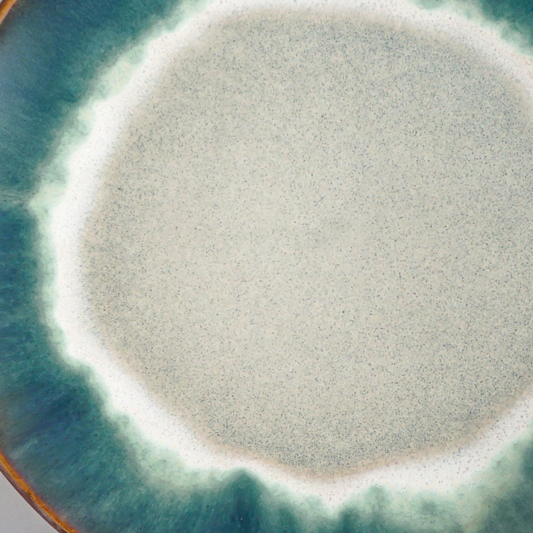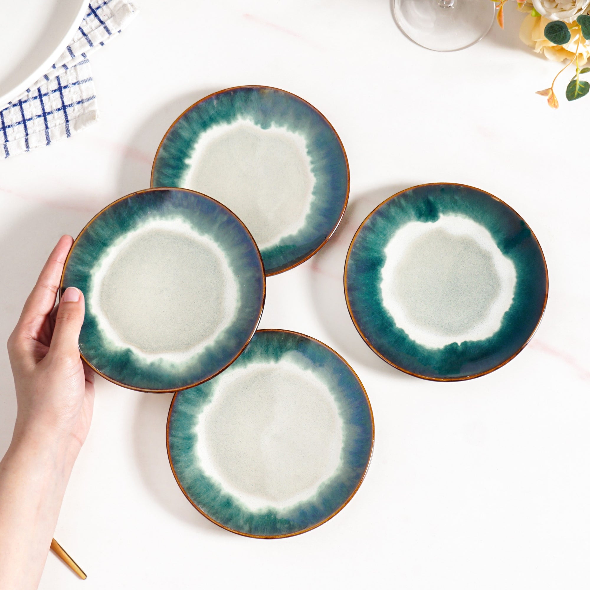 Design: Each plate is crafted from premium stoneware ceramic and is finished with an abstract aqua-green glaze inspired by the patterns of the human eye. The soft blend of the colour flows gently into a neutral centre, giving every piece a calm look. The glossy surface highlights its handcrafted texture, while the subtle detailing at the base adds depth and character to the design.
