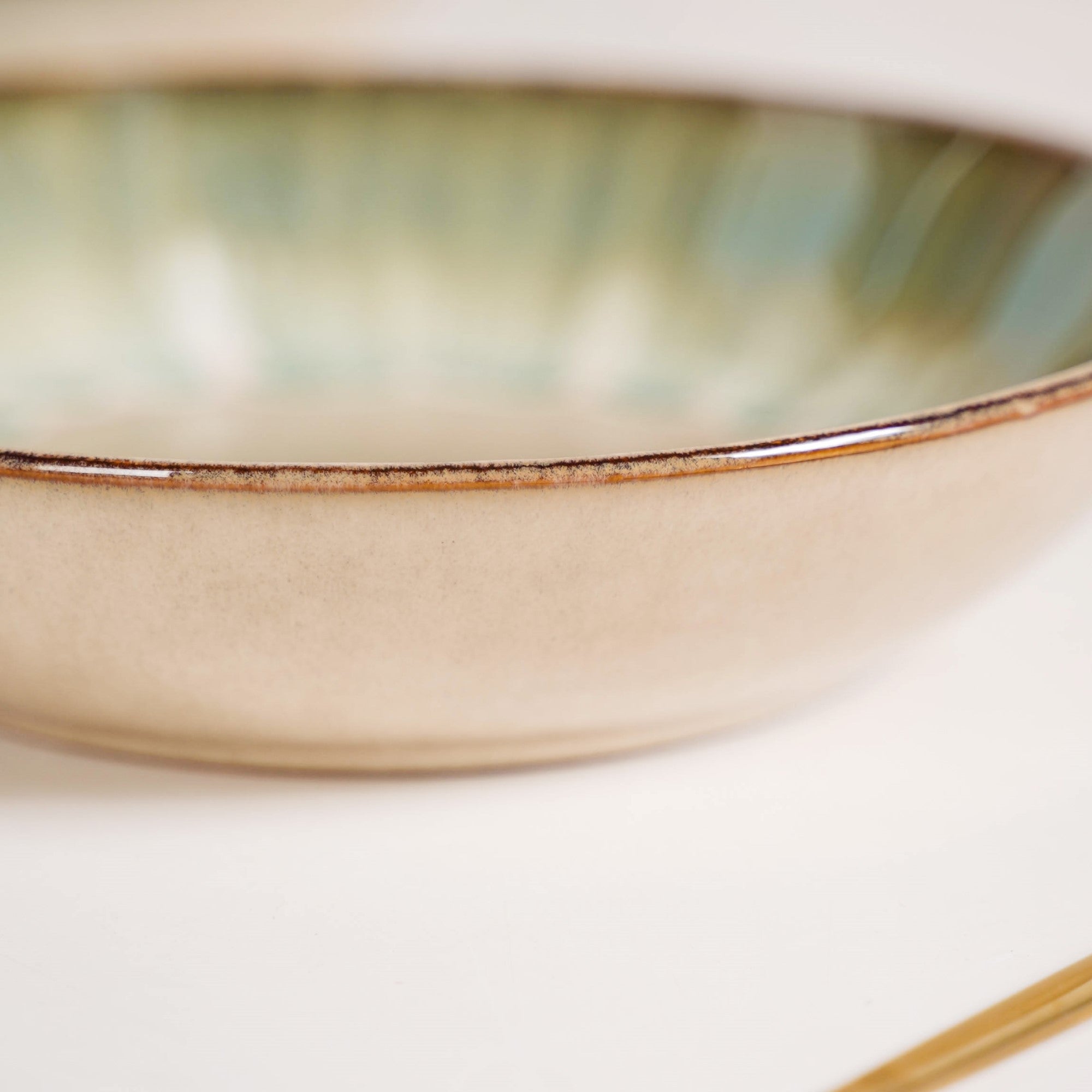 Design: Each bowl is crafted from sturdy stoneware ceramic with a rich glaze finish that blends shades across the sides in a fluid pattern. The centre remains smooth and matte, creating a gentle contrast. The bowls feature a raised base that provides a steady grip on the table and keeps the structure balanced. The rim curves smoothly for easy serving, and the rounded shape offers generous depth for salads, noodles, or shared dishes.