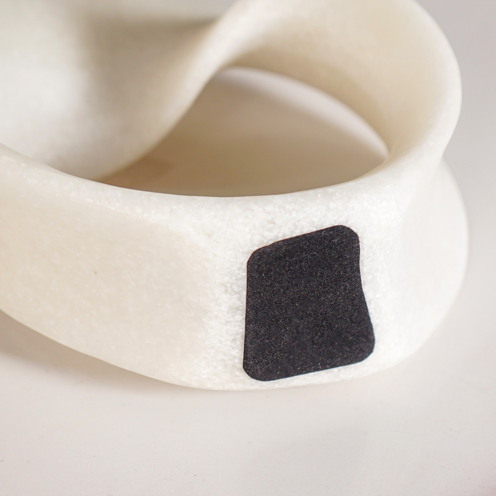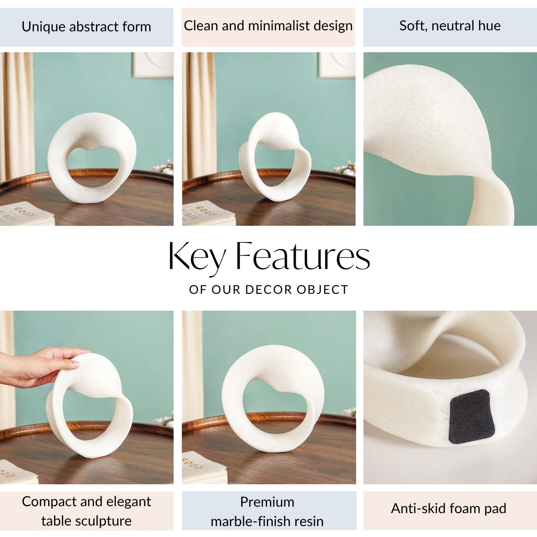 Design: This captivating home decor sculpture features a curved, abstract silhouette defined by its irregular, undulating outer edge contour. The three-dimensional, visually intricate shape resembles a flowing ribbon or an elegant knot. Finished in a soft, off-white or ivory colour with a smooth, matte, refined surface texture, it enhances a clean, minimalist, contemporary aesthetic design. The substantial, solid, symmetrical, rounded base ensures stability, while the central opening creates visual flow. Its compact size suits a tabletop display effortlessly.