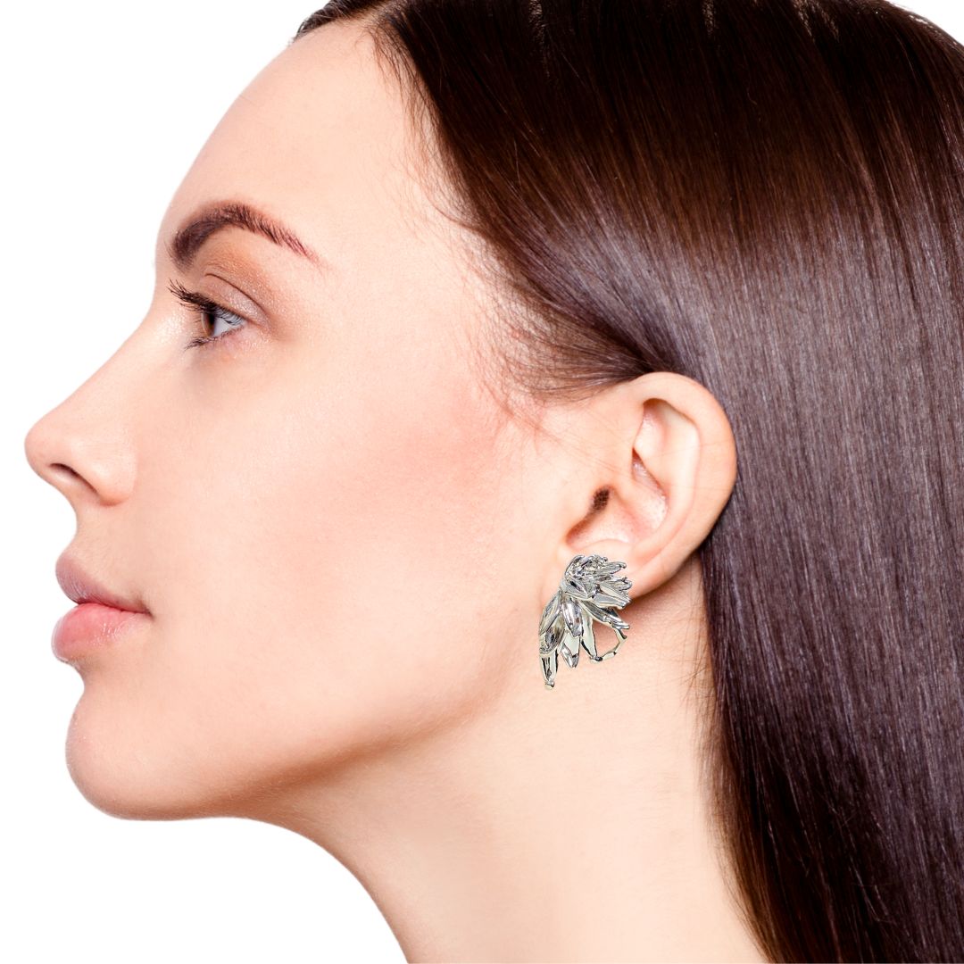 A physical display of elegance and the metaphysical essence of freedom, these earrings embody the grace of swan wings. Inspired by the majestic wings of a swan, they represent beauty, strength, and the limitless potential to soar. Crafted in silver, the delicate feathered design mirrors the fluid motion and refined power of these creatures in flight. Perfect for adding a touch of timeless elegance and empowerment to your style.