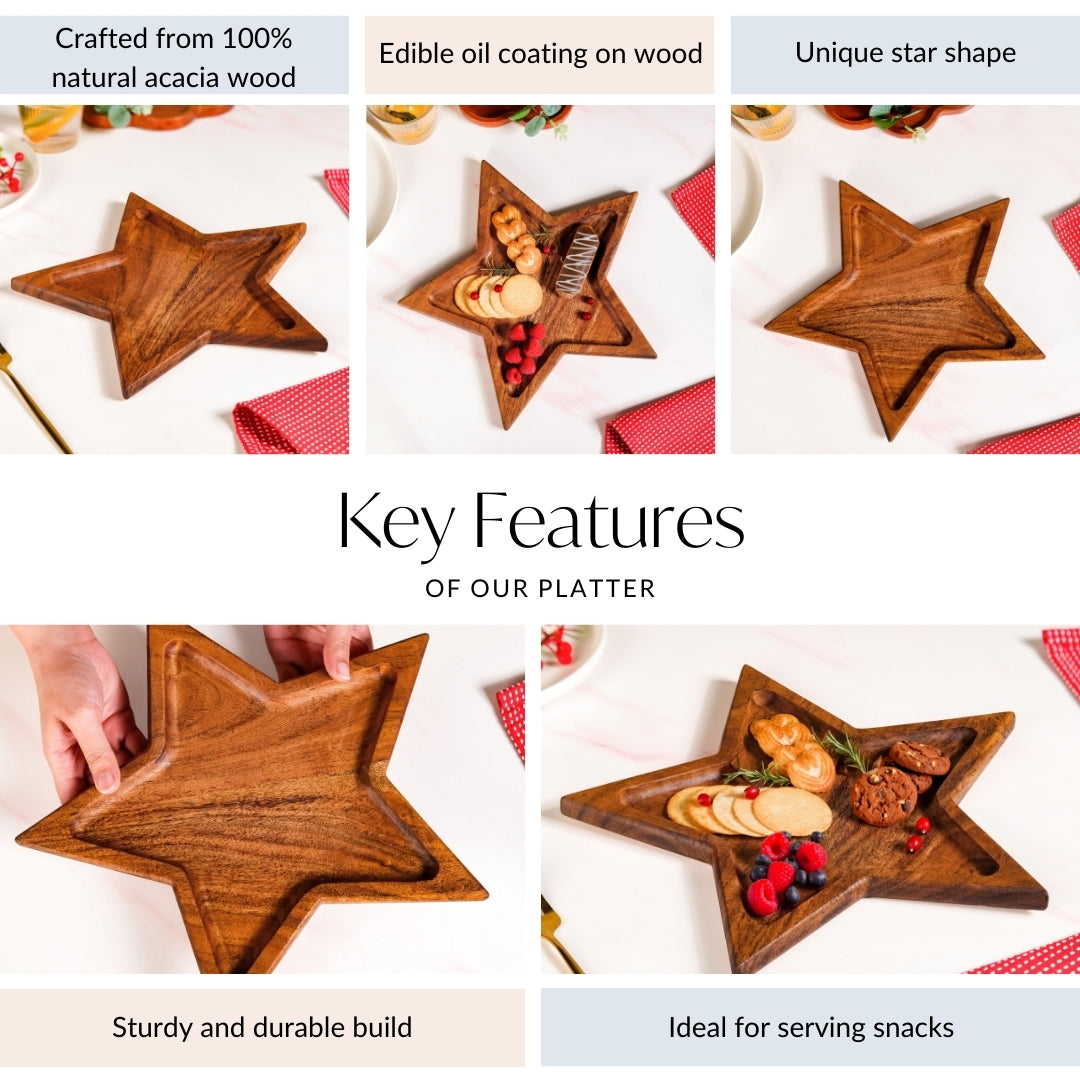 Design: This star-shaped platter is more than just a functional item; it's a piece of art made of 100% natural acacia wood. Its distinct five-point shape catches the eye and adds a touch of charm to your table. The wood's polished natural finish highlights the rich, varied grain, ensuring that each platter is one-of-a-kind. Its unique design makes it a versatile piece that complements both rustic and modern decor styles. Made from 100% natural acacia wood, use a damp cloth to wipe and let it air dry for long-lasting use.