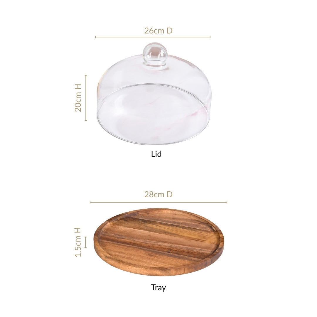Design: Crafted with a round wooden base featuring a smooth finish, this serving stand highlights the natural grain patterns of acacia wood in a warm brown tone. The transparent glass cloche has a rounded, bubble-like shape with a seamless single-piece structure that sits snugly in a shallow groove on the base. A clear, scratch-resistant surface allows easy viewing of the contents, while the rounded knob handle ensures a comfortable grip. For long-lasting use, wipe with a damp cloth and let it air dry.