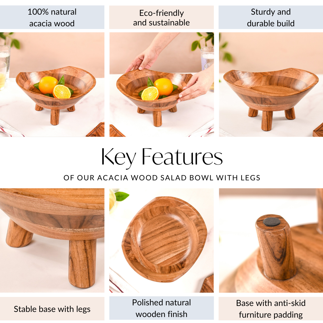 Benefits: Constructed from pure acacia wood, the salad bowl is 100% sustainable and eco-friendly. The material is a dense and heavy-duty hardwood that is also resilient to scratches, chipping, and dents. This makes the salad bowl adept at withstanding daily use. Its waterproof nature prevents swelling, warping, and cracking. This maintains the polished appearance of the bowl for an extended period. Finally, the natural oils and compounds in the wood have antimicrobial properties to fend off germs. This makes the bowl a clean and hygienic essential.