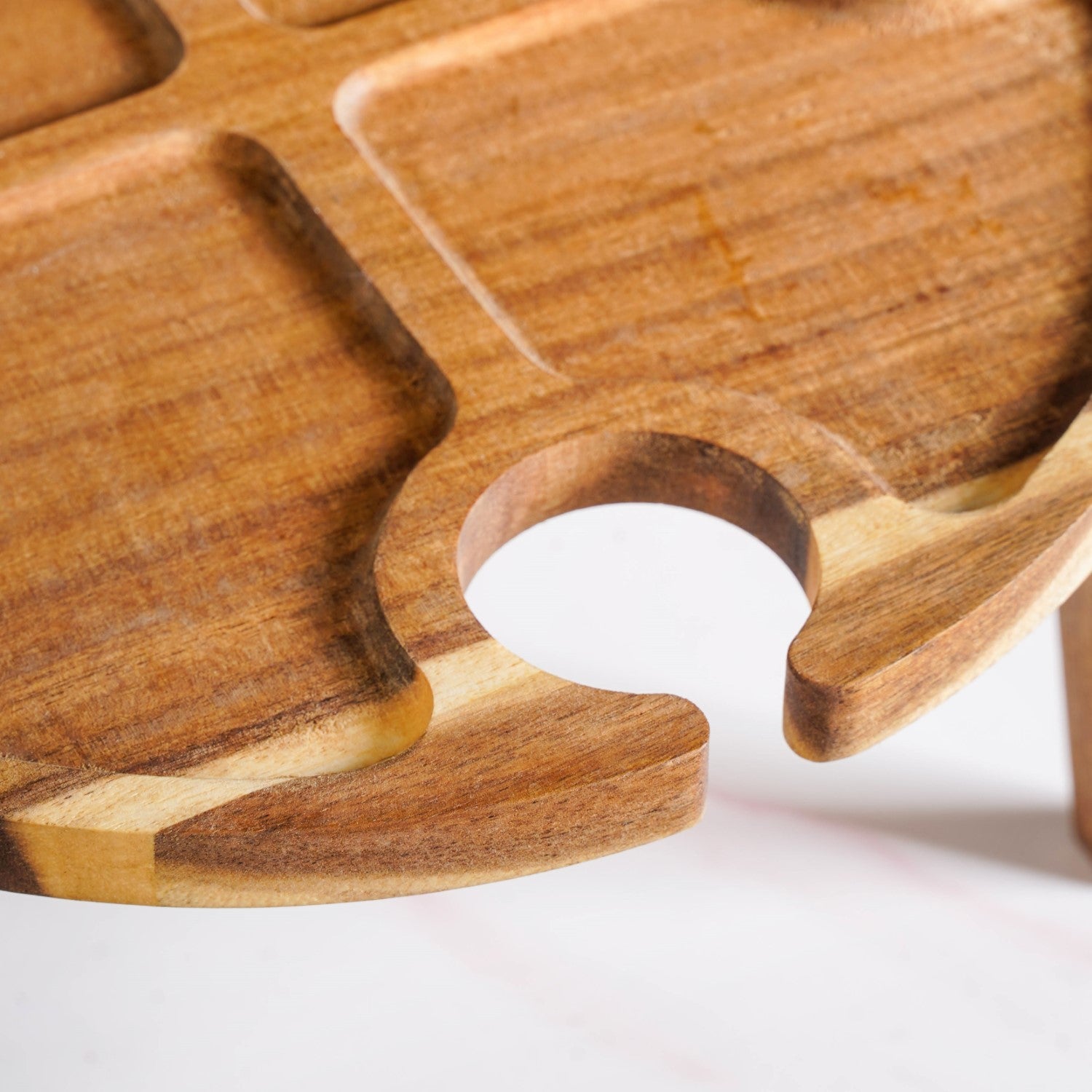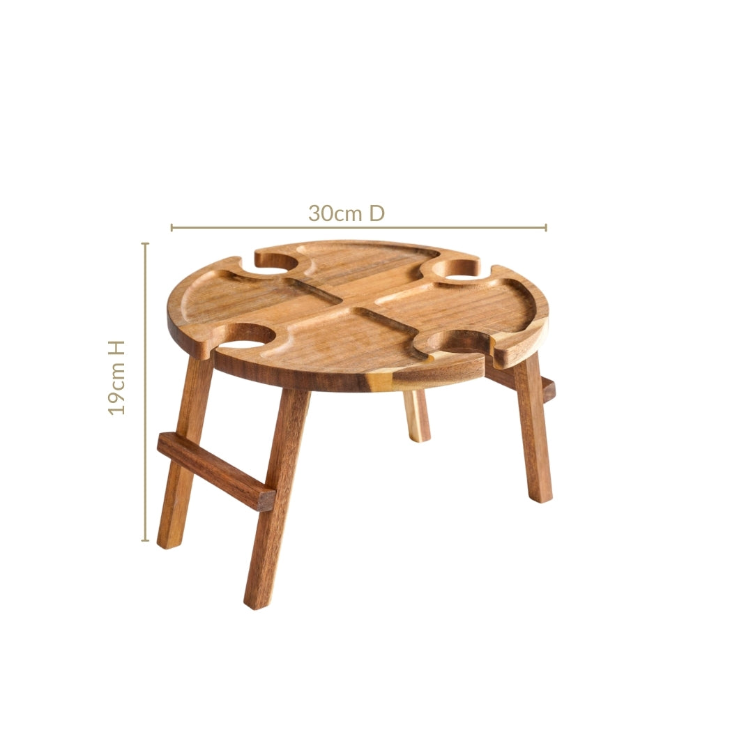 Benefits: Crafted from rich, durable acacia wood, the table flaunts a warm grain finish and smooth surface with natural polish. Made with 100% food-safe, lead- and toxin-free acacia wood, the table is finished with an edible oil coating for enhanced durability. Its eco-friendly, sustainable build is sturdy yet lightweight, making it easy to carry and clean. The smart layout prevents spills and ensures your wine and nibbles stay in place, even on uneven ground.