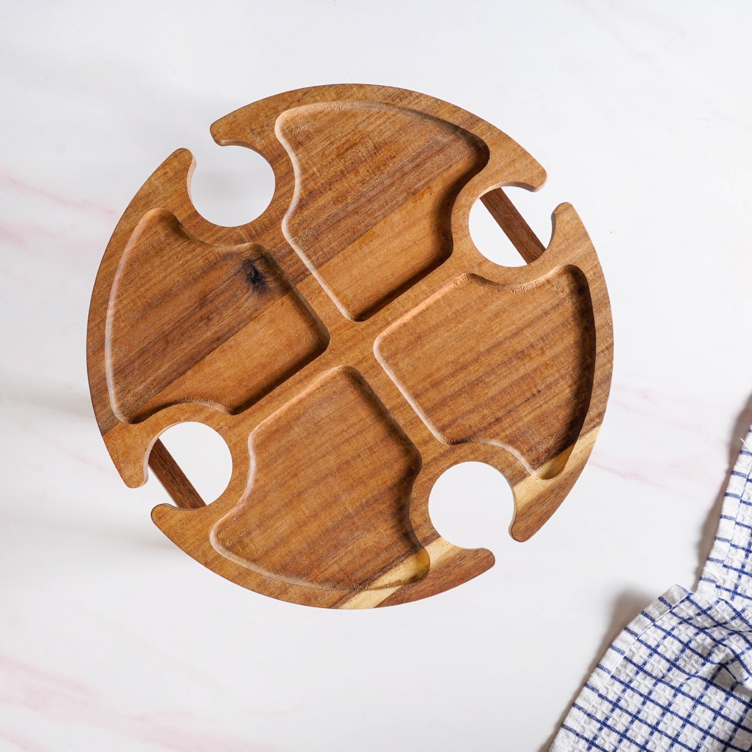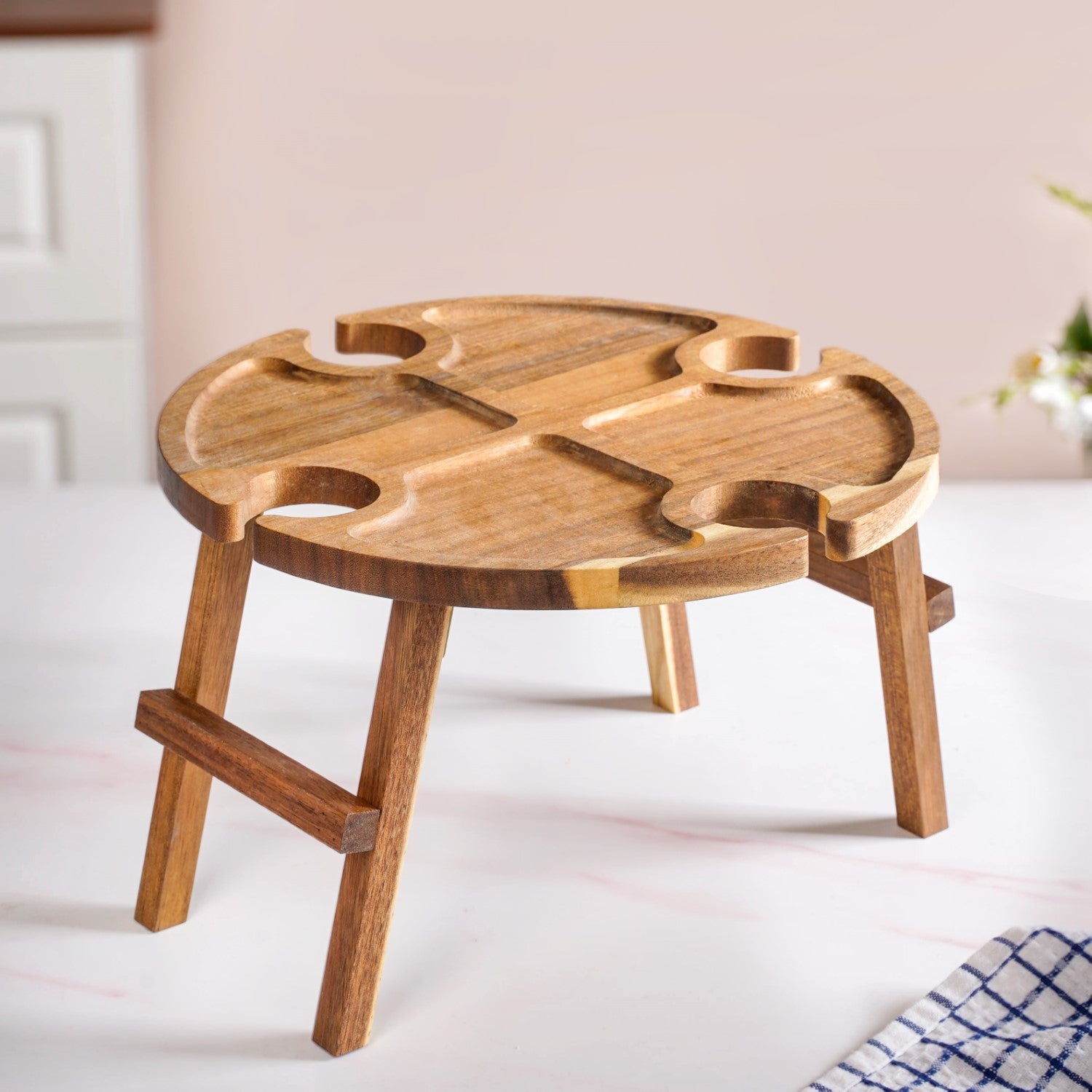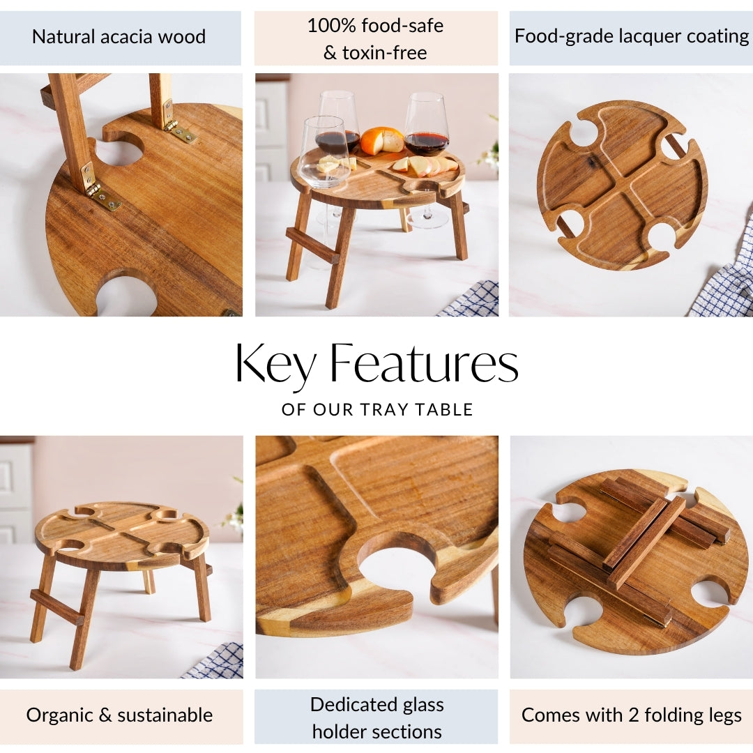 Design: Designed to hold four wine glasses and a bottle securely, along with ample space for snacks and cheese, this elevated table makes serving effortless and stylish. Its compact, foldable design ensures portability without compromising on charm. The table flaunts a warm grain finish and smooth surface with natural polish. The circular shape features smart cut-outs for four wine glasses and a bottle, along with carved sections to neatly place snacks. Foldable legs tuck in neatly for easy storage and setup. For long-lasting use, wipe with a damp cloth and let it air dry.