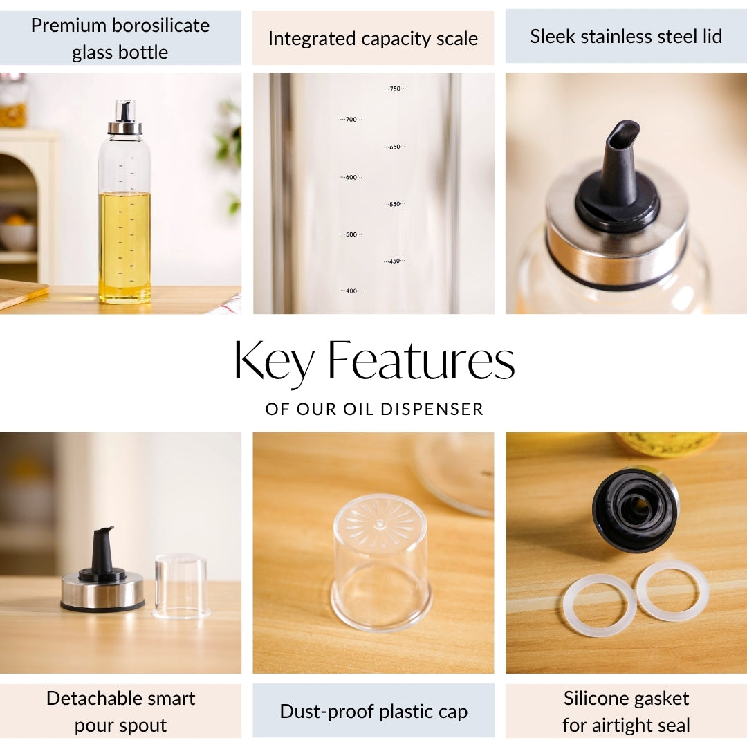 Design: Witness a seamless blend of practical design and aesthetic appeal, meticulously formed from superior borosilicate glass. This oil storage vessel lets the vivid contents shimmer through its unblemished transparency. Precisely etched volume measurements are discreetly incorporated into its streamlined contours, offering an instant visual reference for accurate portioning. It is topped with a finely polished lid of gleaming, brushed stainless steel. Extending from this cap is a removable PVC spout. Giving finishing touches to its thoughtful structure is a dedicated, clear PVC cap that securely encases the pouring head.