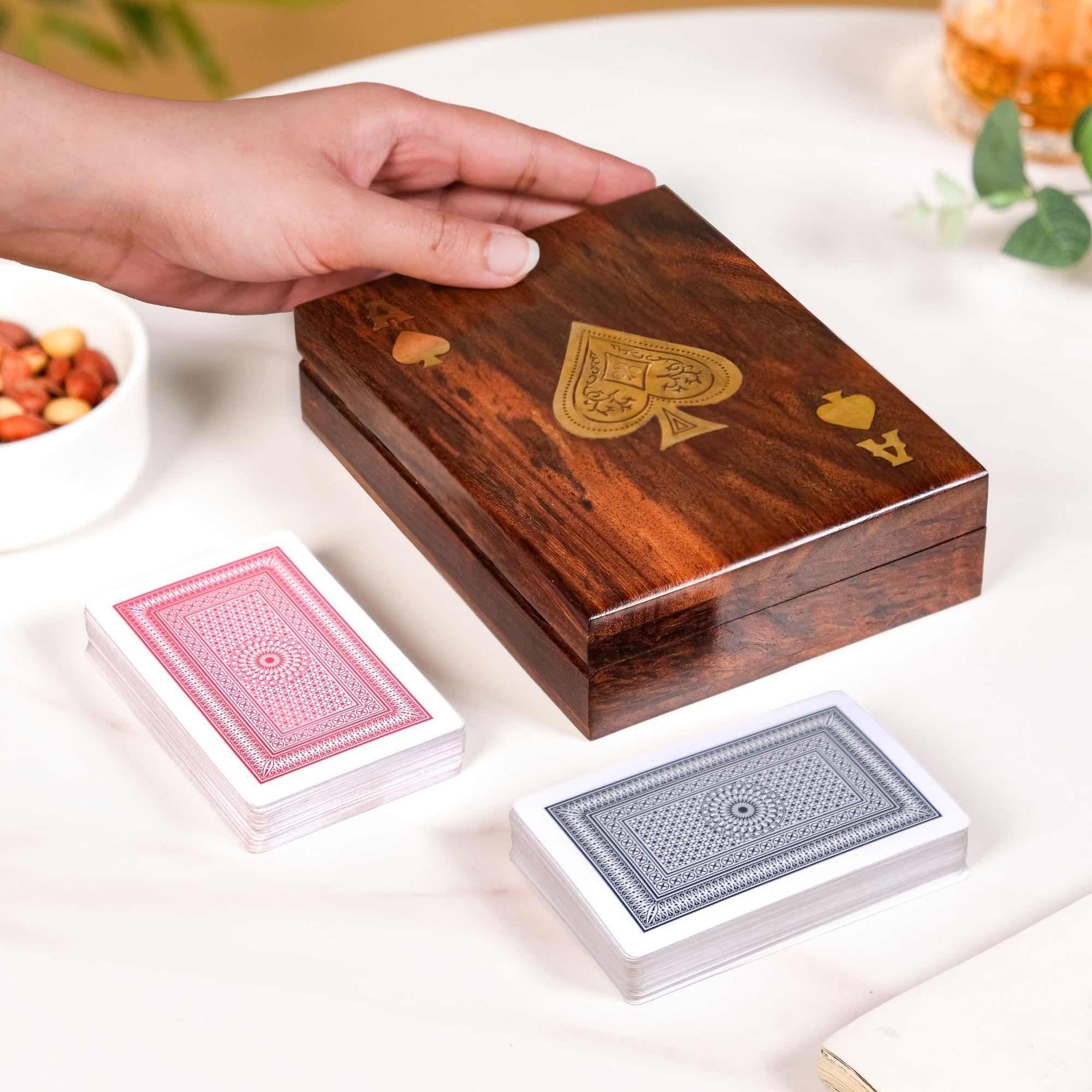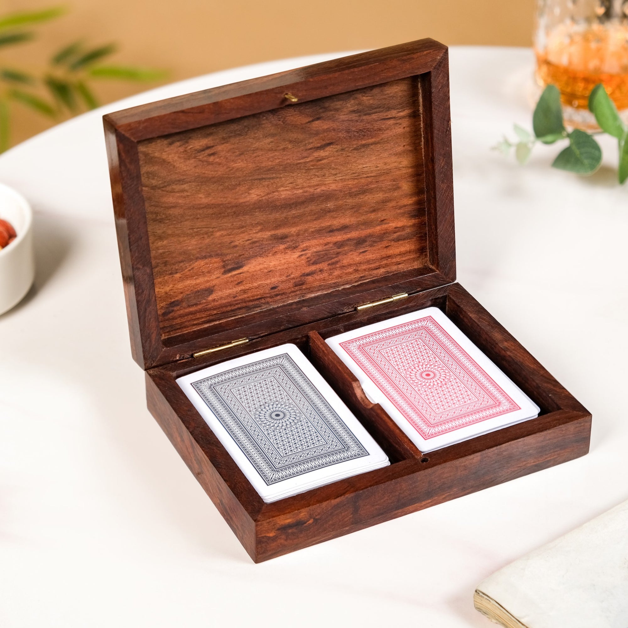 Benefits: This card box provides more than just a place to keep your deck of cards. The durable Sheesham wood offers a sturdy and stylish storage solution, protecting your playing cards from damage and dust. With a deck of cards included, it's a complete set ready for use. Its elegant design makes it a beautiful decorative piece that can enhance your home decor while also serving as a perfect and stylish centerpiece for game night.