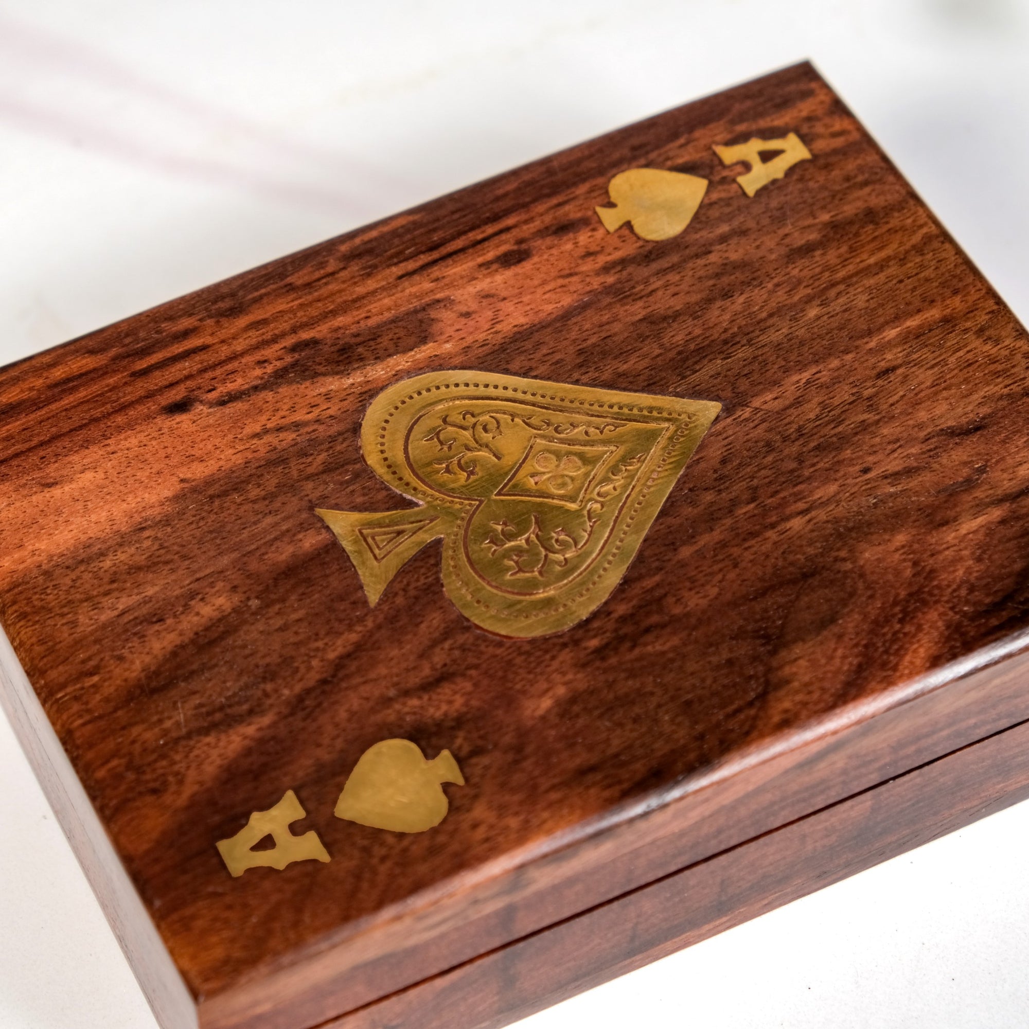 Crafted for those who demand both style and substance, this Sheesham wood box is a true masterpiece. The striking brass Ace of Spades inlay commands attention, transforming a simple card holder into a work of art for your home.