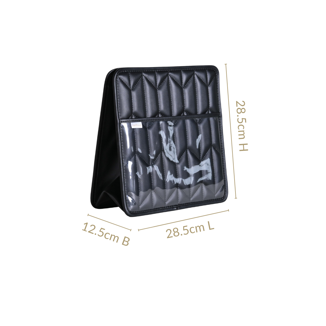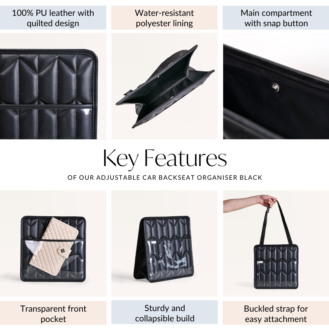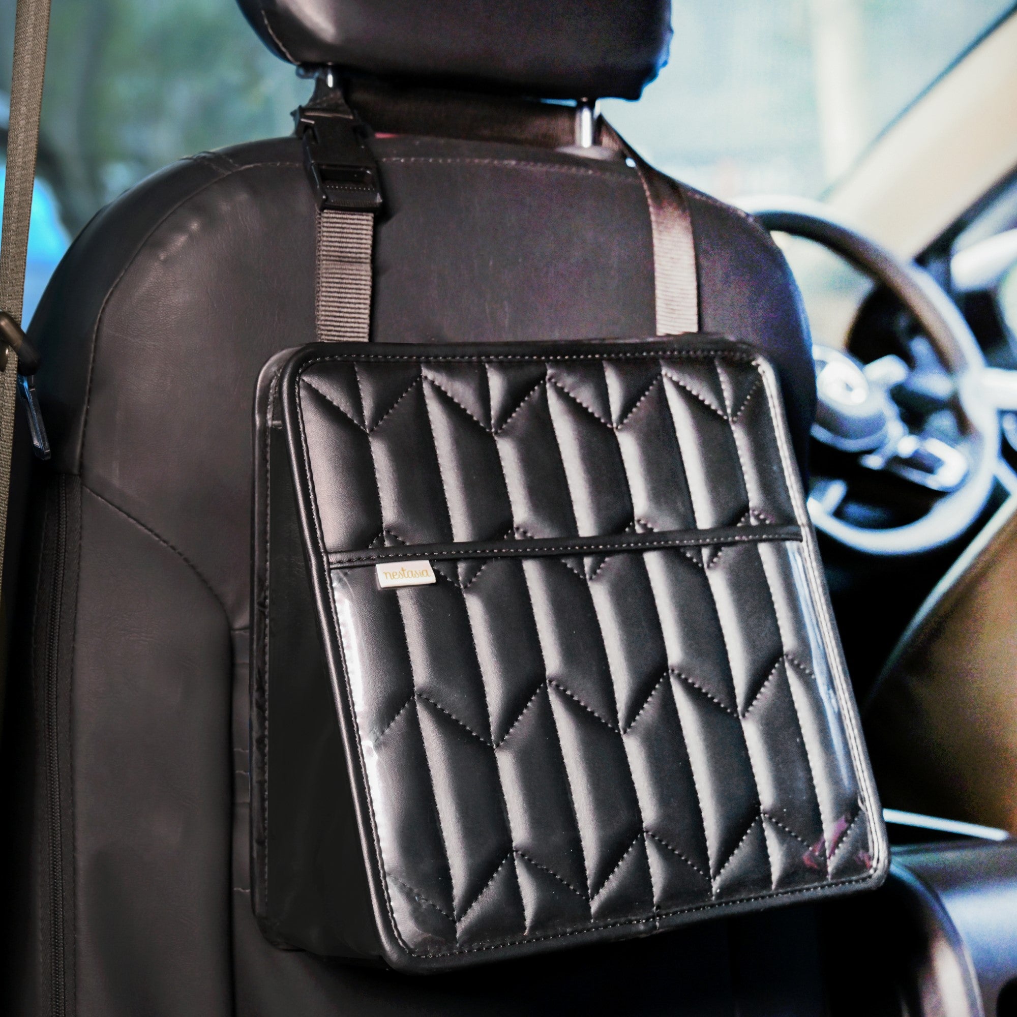 Design: This car backseat organiser features a quilted 100% PU leather exterior, blending sophistication with durability. It includes a main compartment with a snap button for secure storage and a transparent front pocket for easy access to small items. The sturdy, collapsible build and buckled strap ensure simple attachment to the backseat, providing a tight and stable fit.