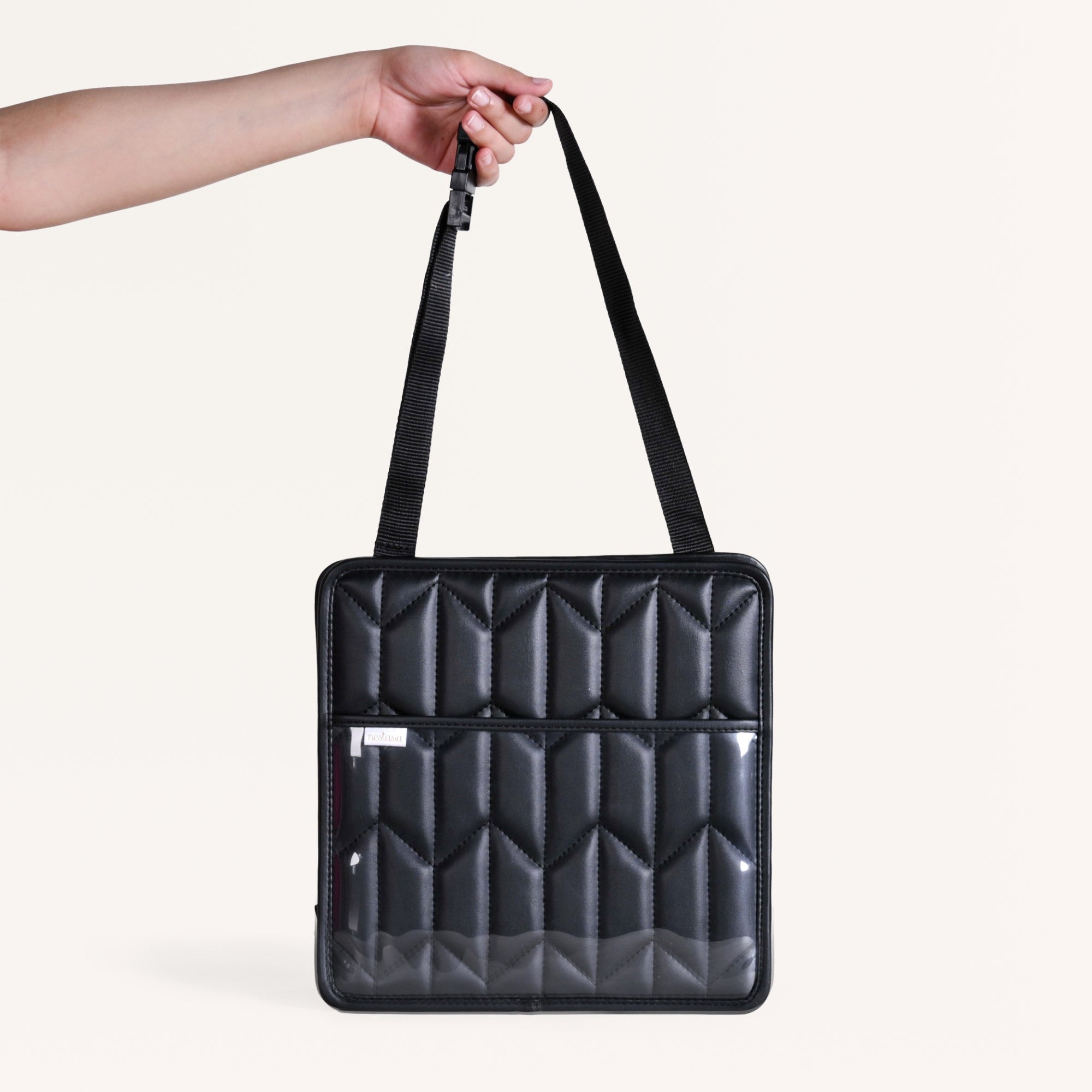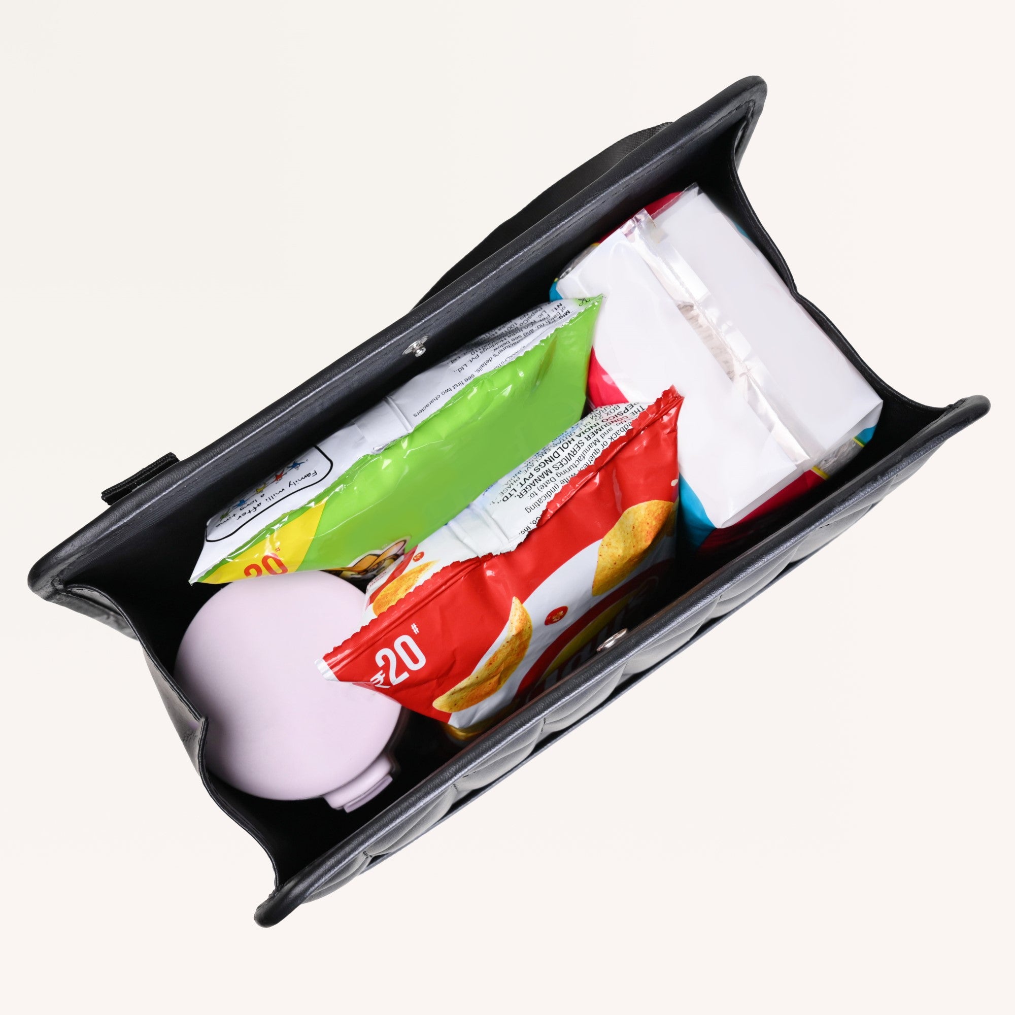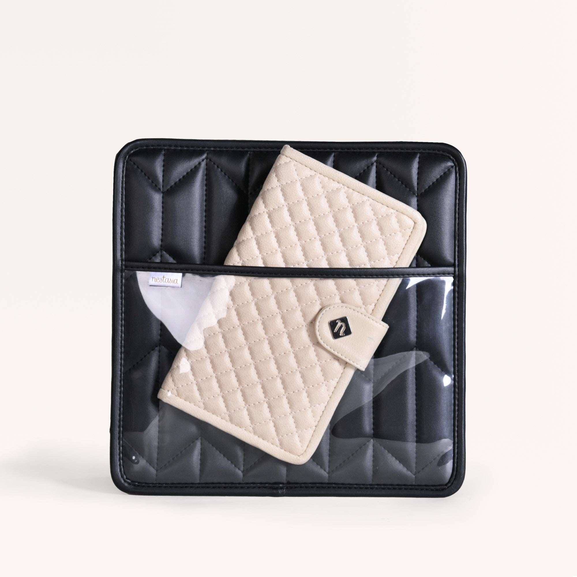 Design: This car backseat organiser features a quilted 100% PU leather exterior, blending sophistication with durability. It includes a main compartment with a snap button for secure storage and a transparent front pocket for easy access to small items. The sturdy, collapsible build and buckled strap ensure simple attachment to the backseat, providing a tight and stable fit.