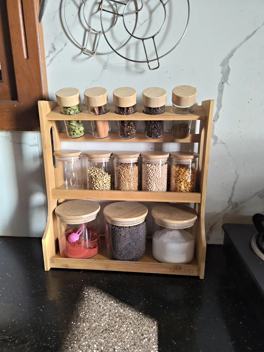 Varun dhara This is the perfect kitchen counter organiser for storing spices and powders . Love the wooden lids and frame . Overall a excellent product